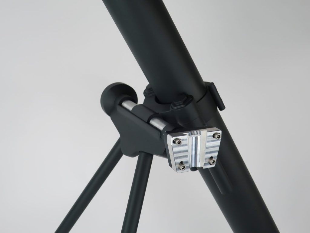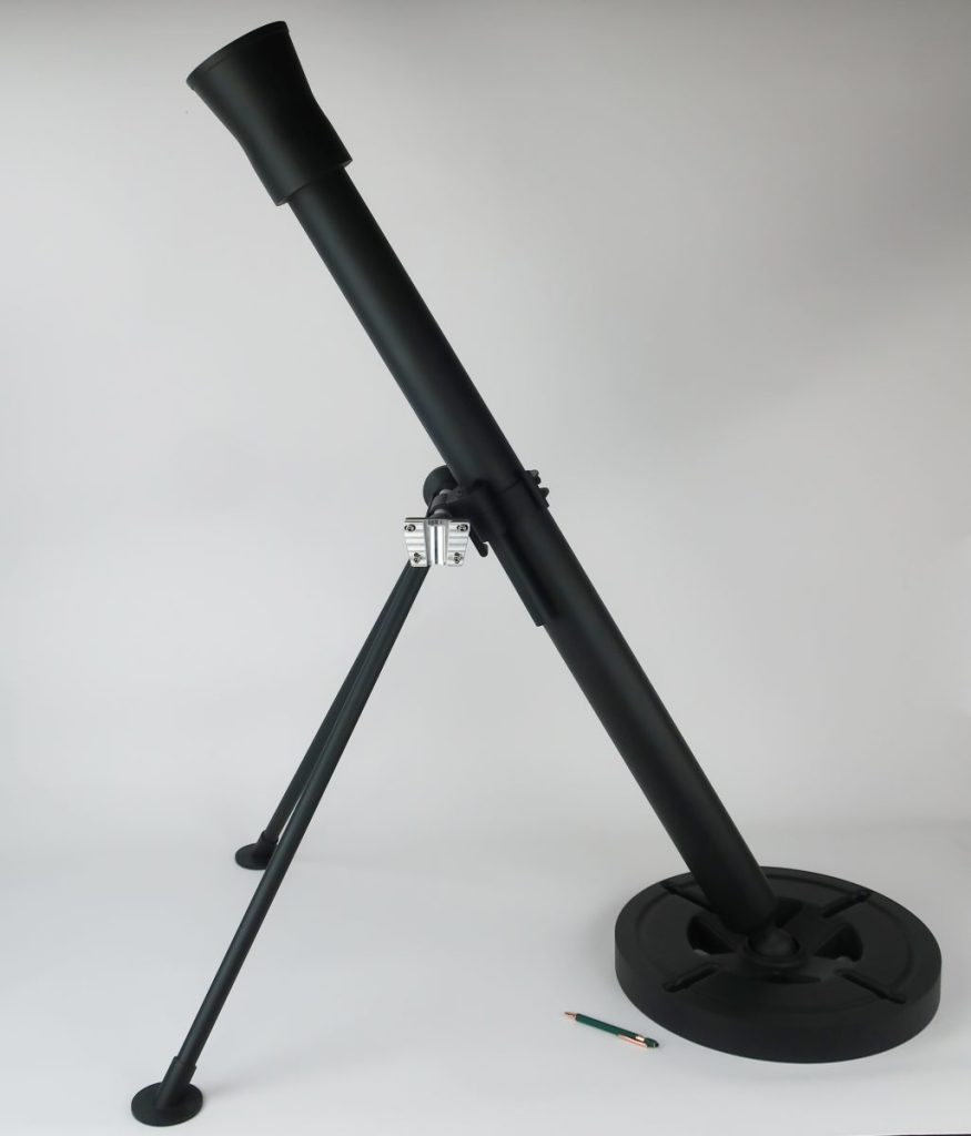 This full scale 81mm mortar model was designed to come apart in 6 pcs to make it easy to transport to customer events and trade shows. The pieces include 1) 2pcs PVC tube that join in the middle, 2) a center bracket that includes the aluminum machined optics dovetail, aluminum cross-pin, and 1/4″ aluminum bracket that holds it all together 3) 2 steel legs and 4) an 18″ 3D printed base.