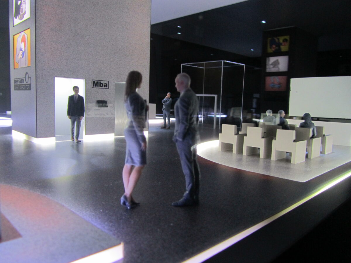 The centerpiece of this prop was the miniature people installed through out the art tower model. These figures are replicas of real people who were scanned and 3D printed in color.