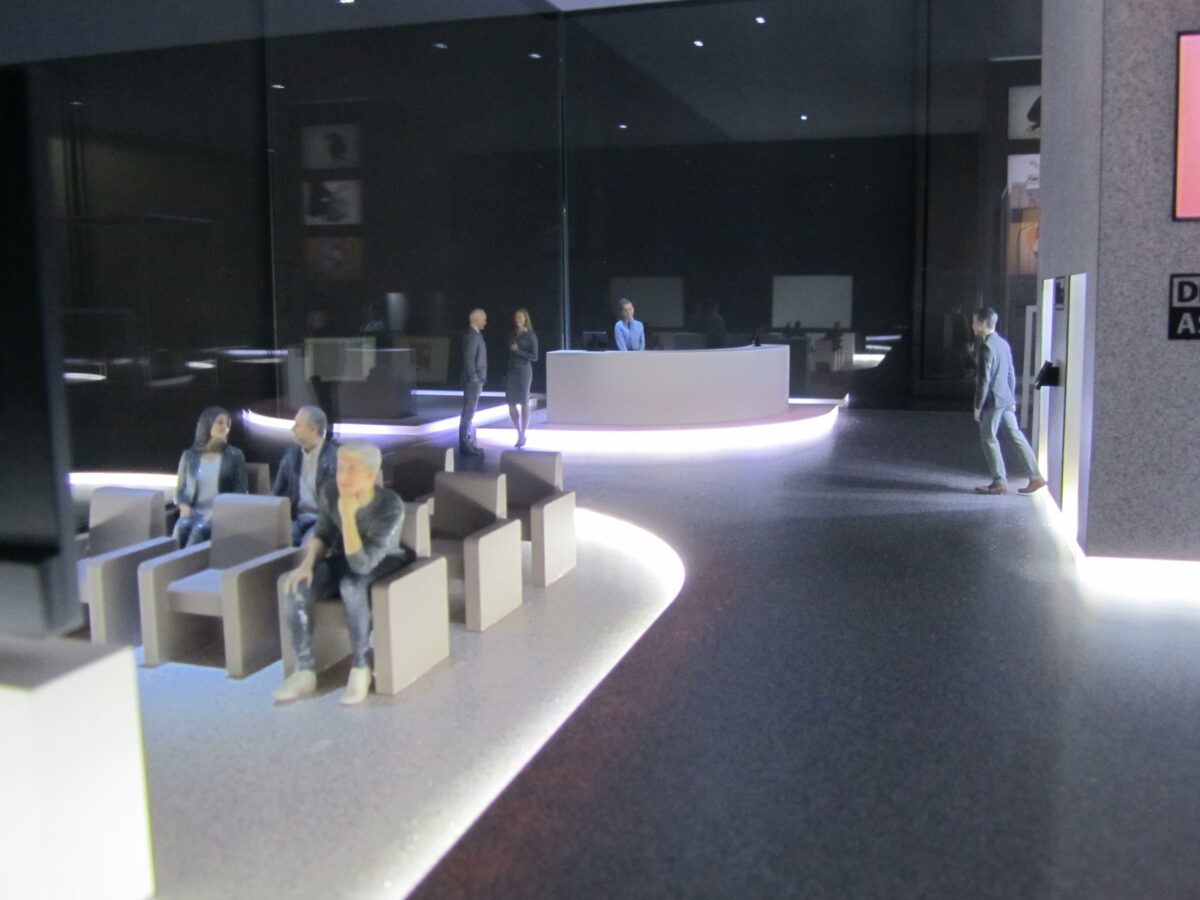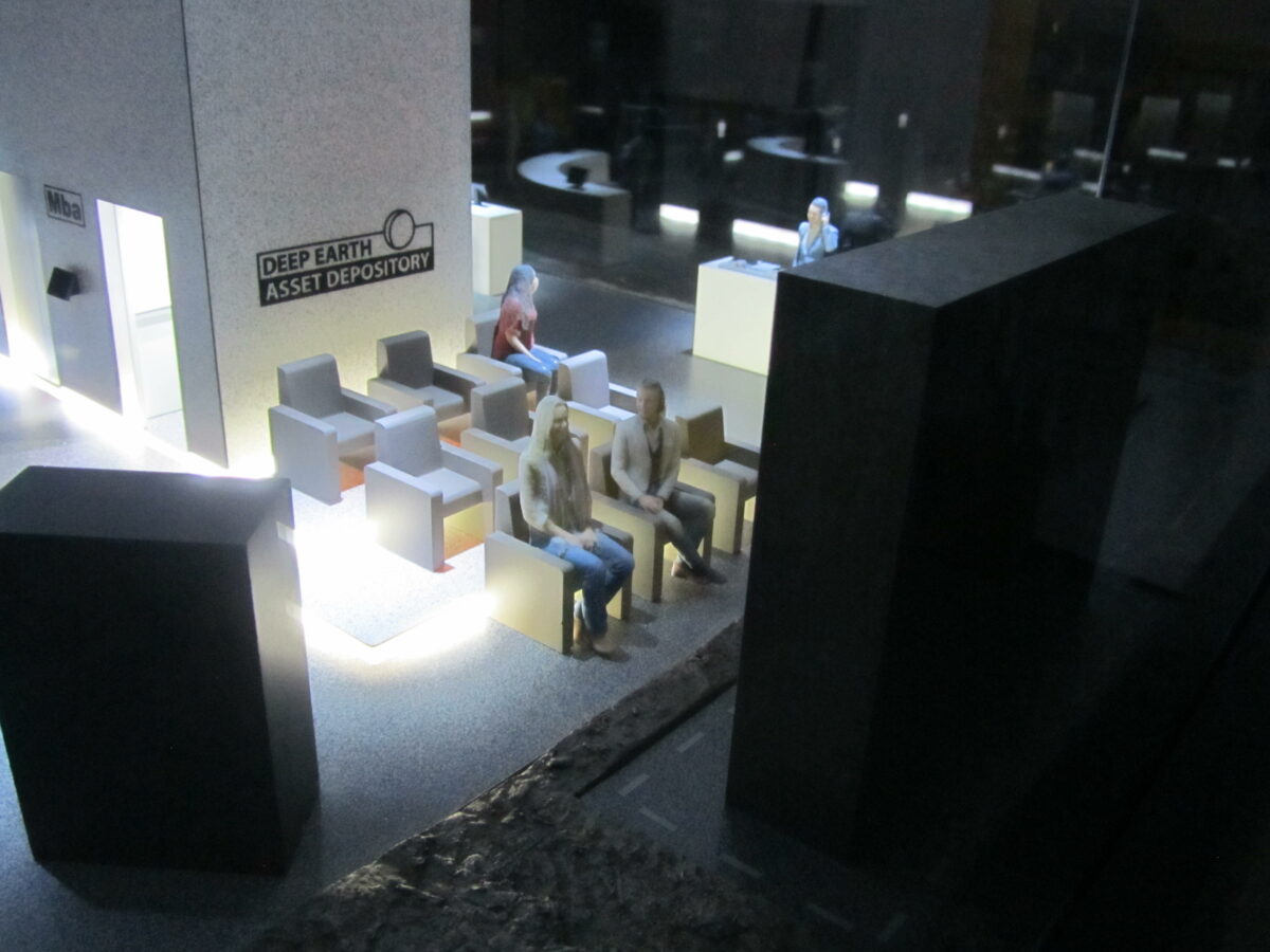 The art tower model rests in a handmade cabinet, with plate glass walls and extensive, elaborate LED lighting through out. The rock surface that the storage vault resides in was created out of chipped particle board, sealed and painted. The furniture was a combination of hand built materials and 3D printed parts. Our client’s actual art work was miniaturized and placed on the walls of the storage vault.