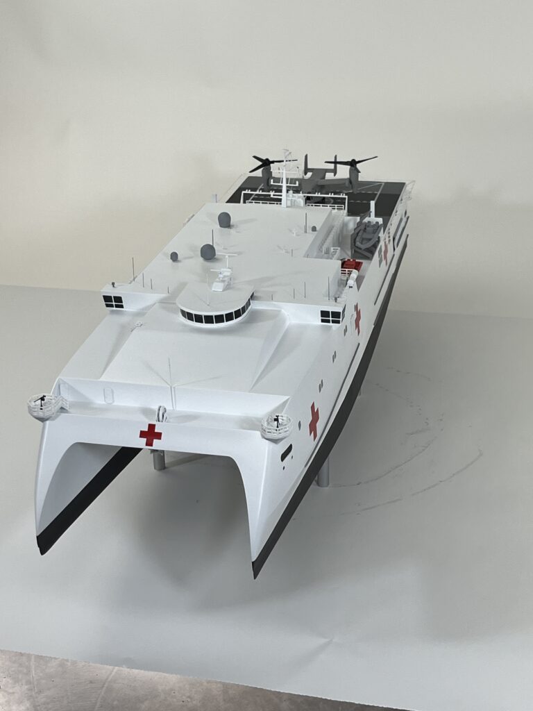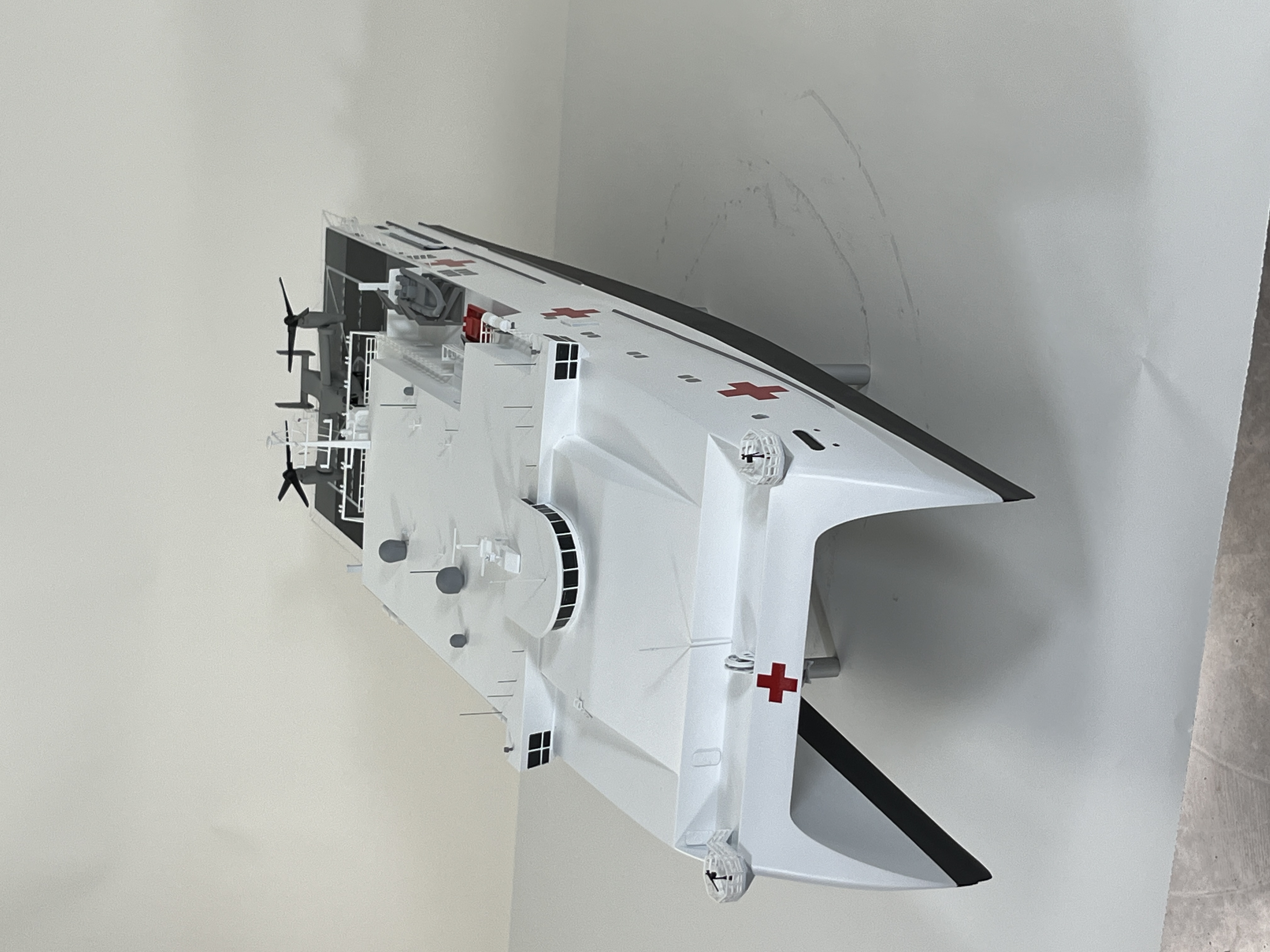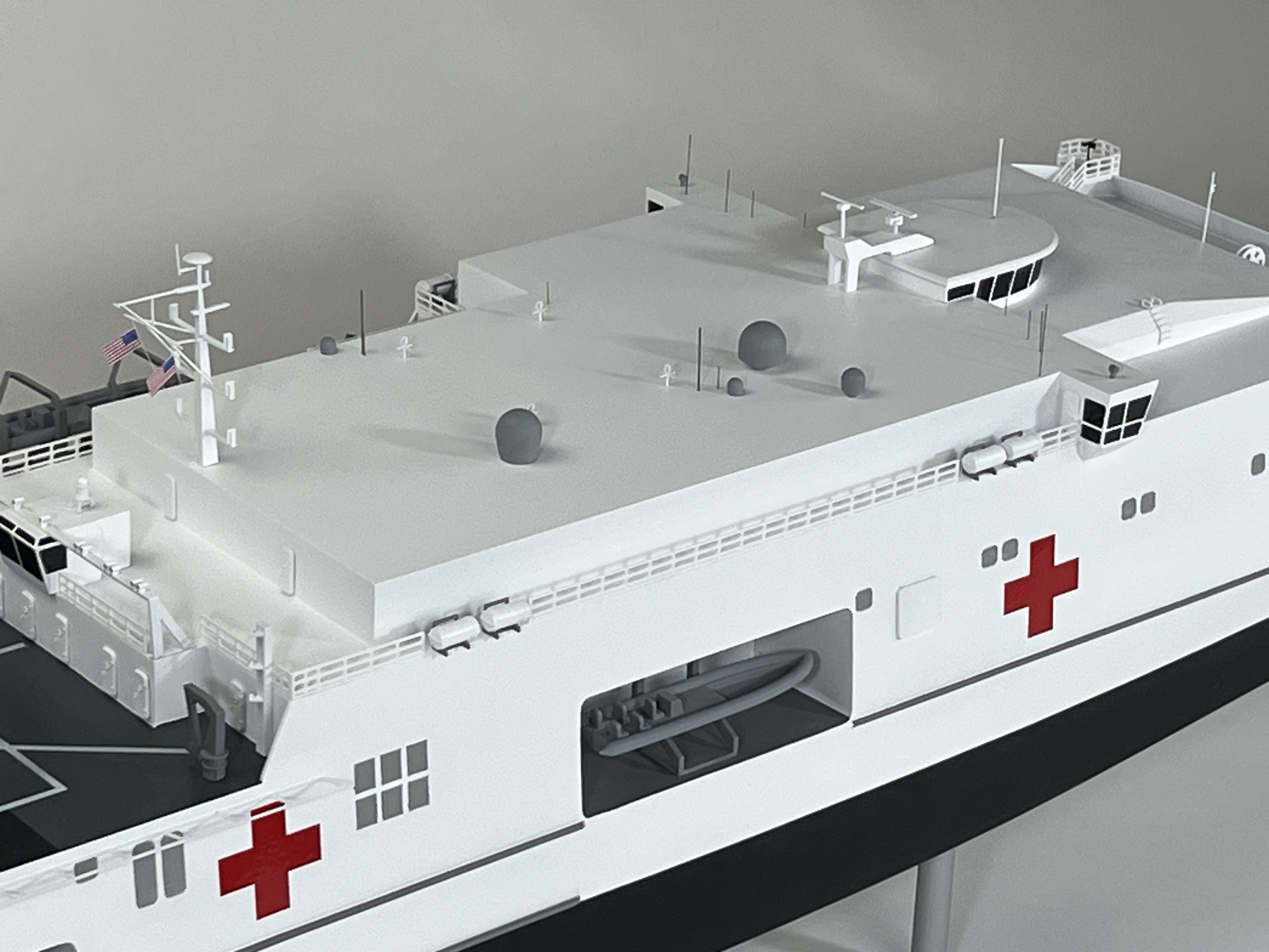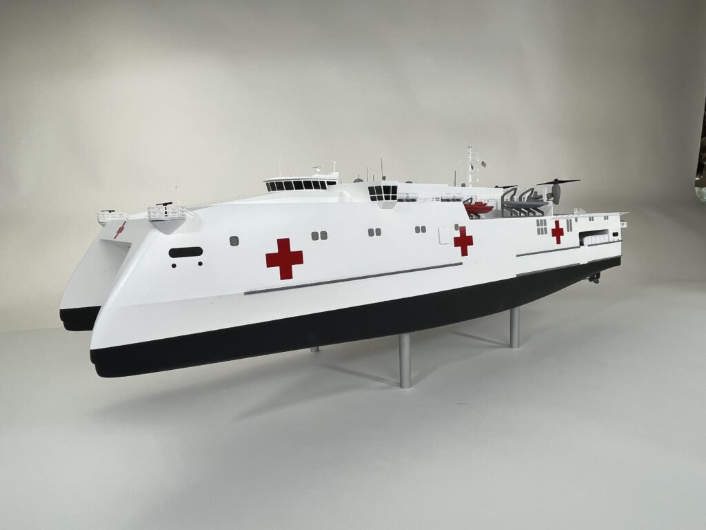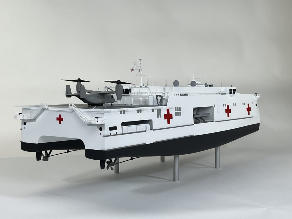 This Emergency Medical Ship model was built for Austal USA to be used at various trade show throughout the world. The 1/125th scale which is a final model size of approximately 3 feet long and 9 1/2″ wide. It is displayed on a walnut base with a mirror on the bottom to show the details on the hull.