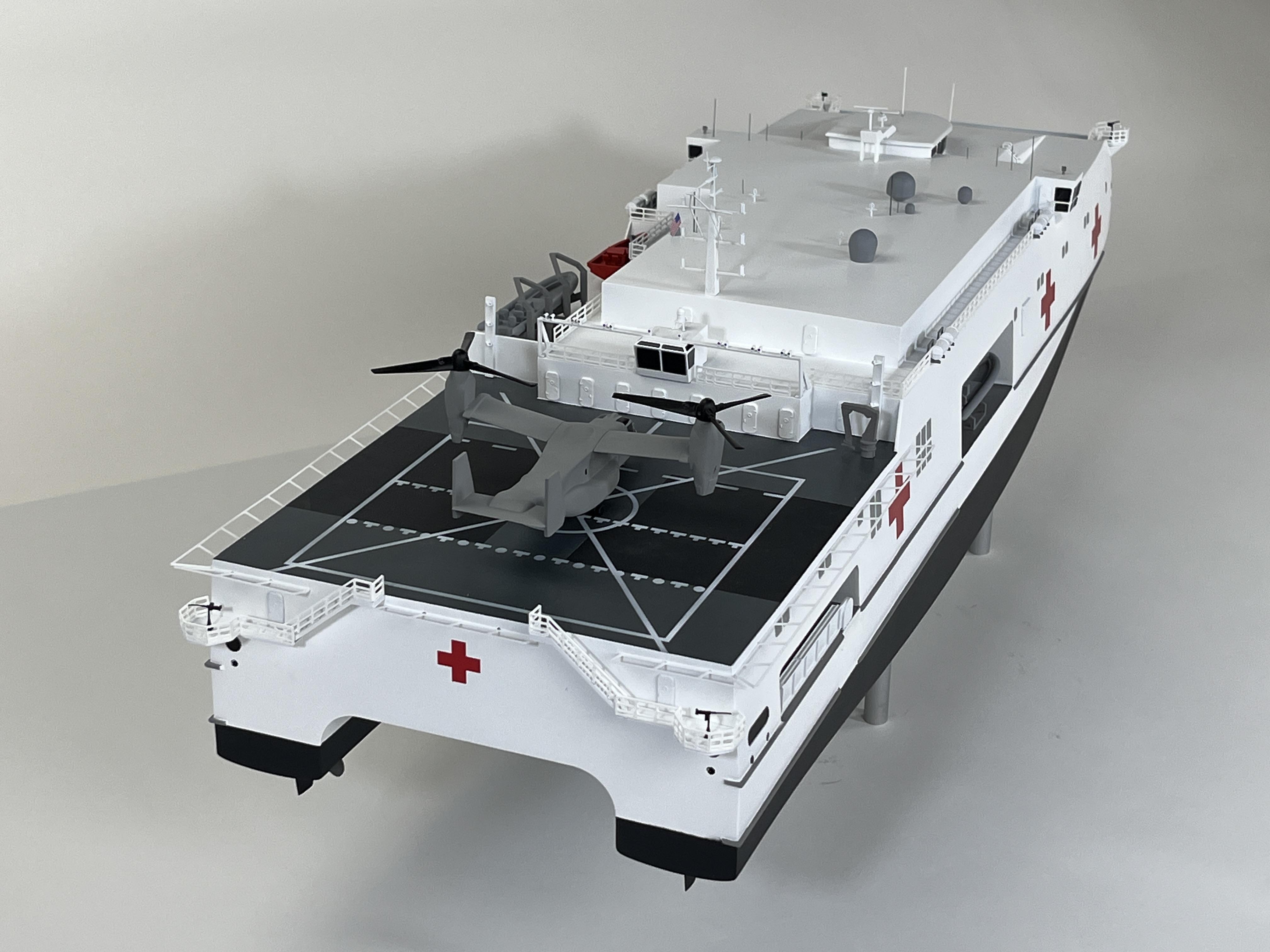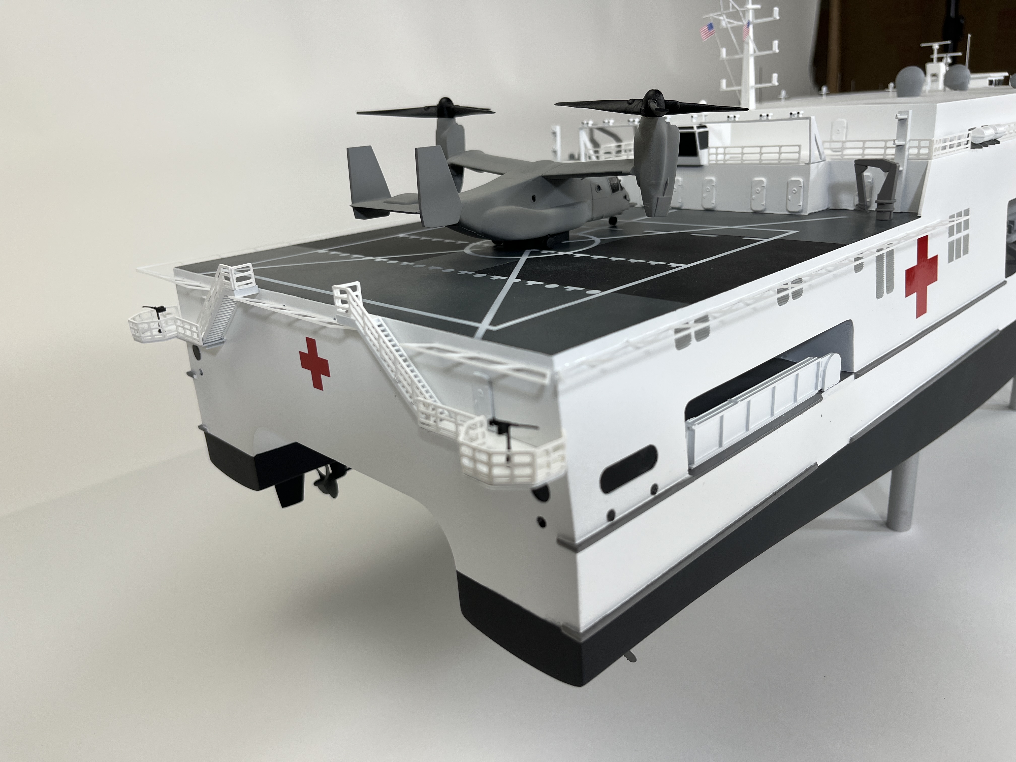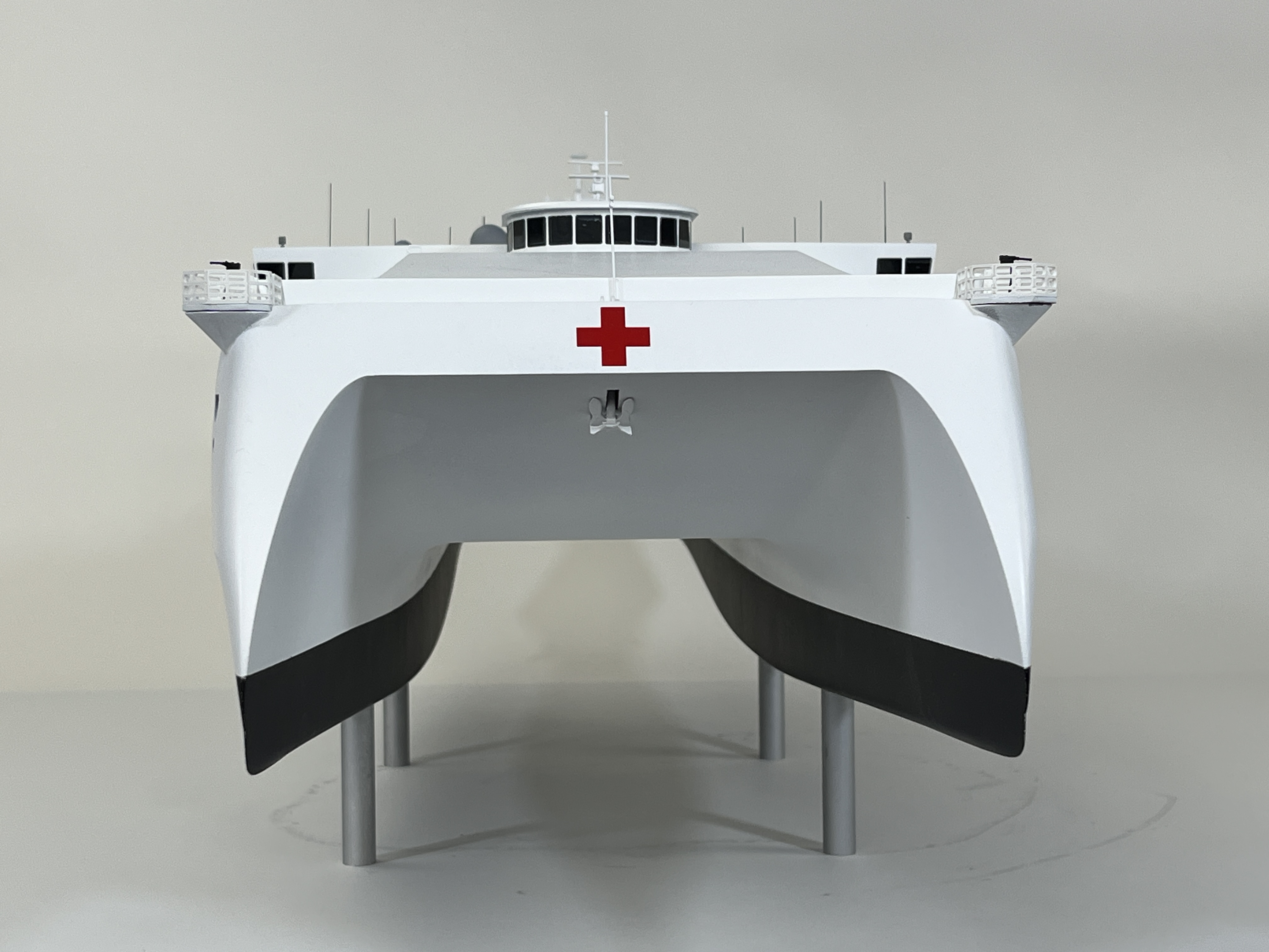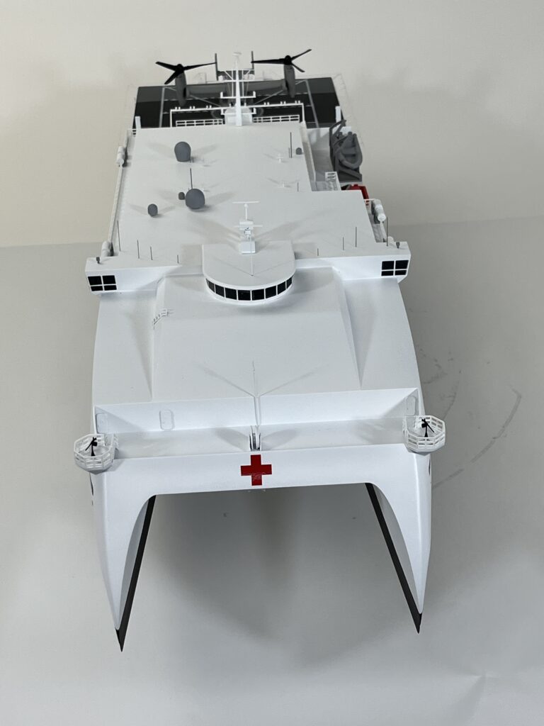 This Emergency Medical Ship model was built for Austal USA to be used at various trade show throughout the world. The 1/125th scale which is a final model size of approximately 3 feet long and 9 1/2″ wide. It is displayed on a walnut base with a mirror on the bottom to show the details on the hull.