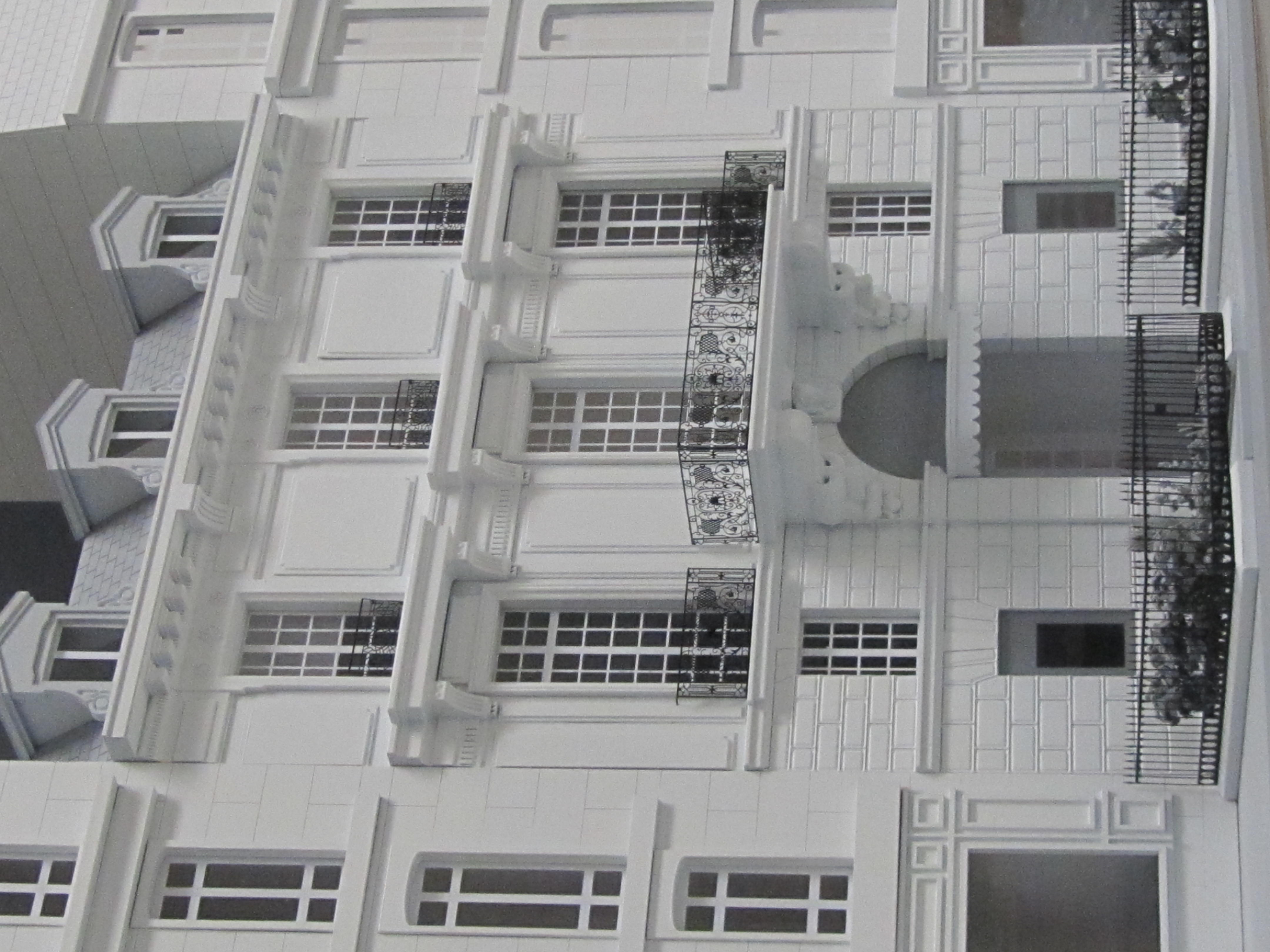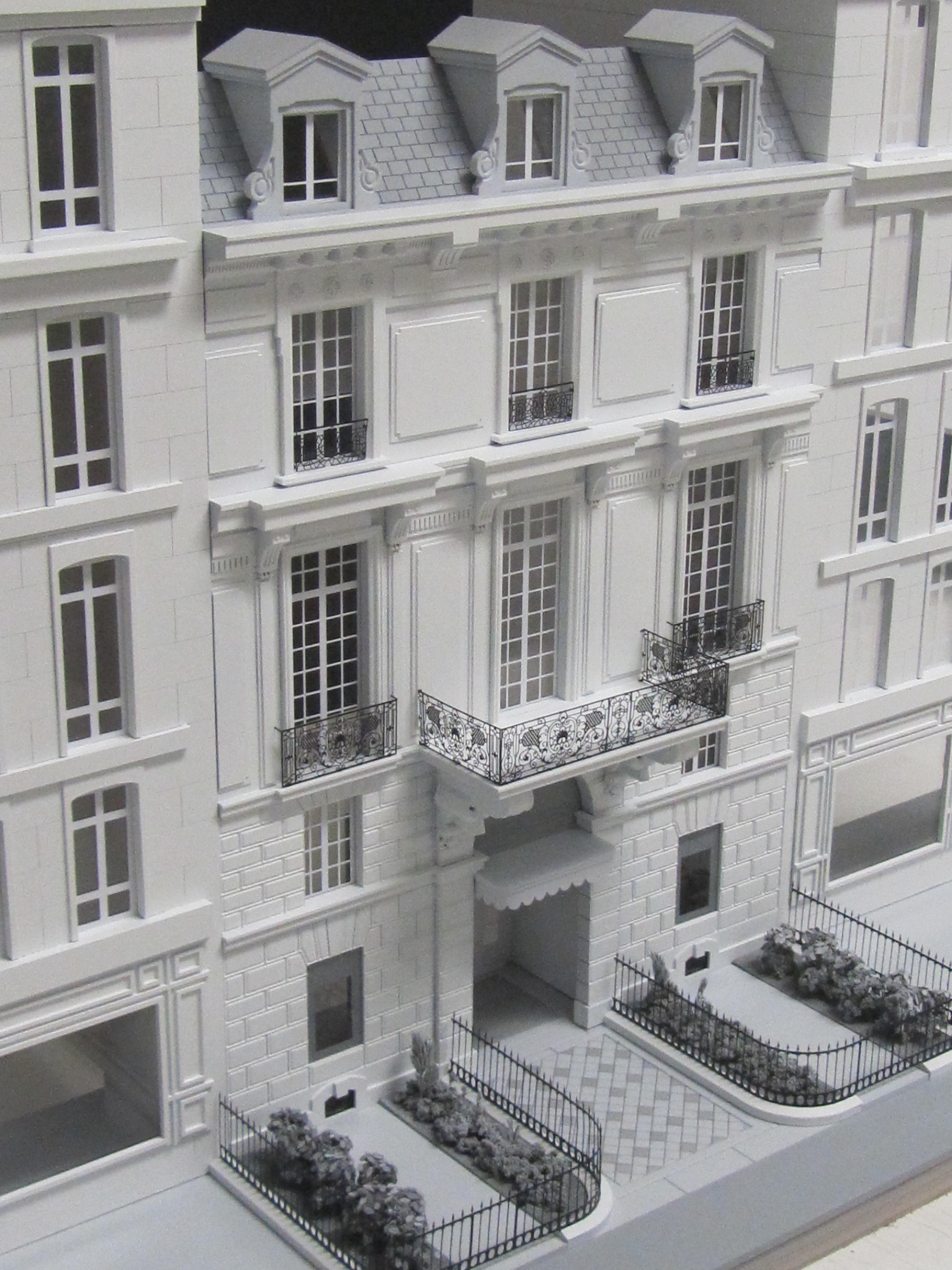 The walls of the building were made of laser cut plastic. It featured intricate railings around the windows, created by brass etching. Custom foliage was added to complete the look of this architectural prop model.