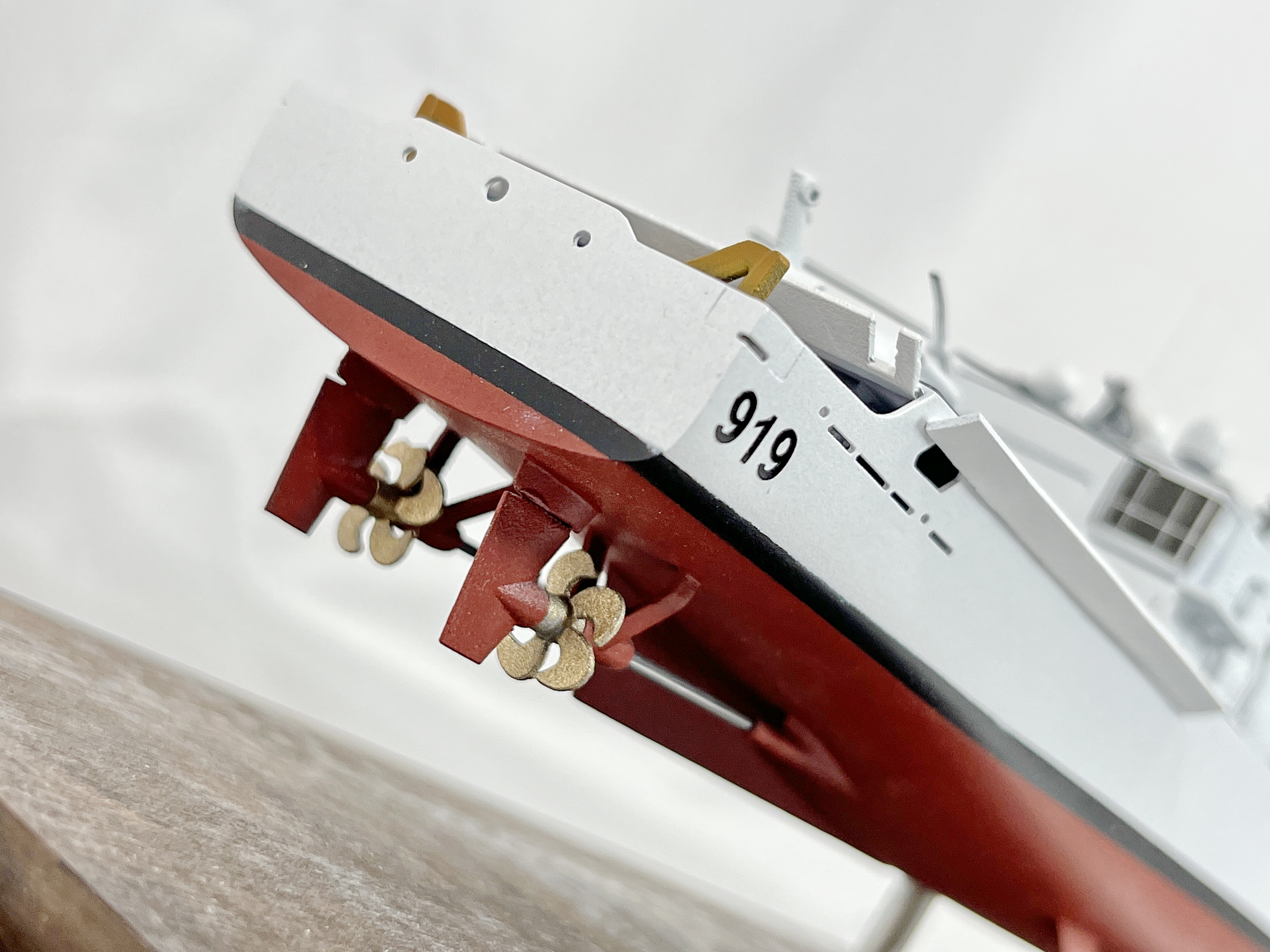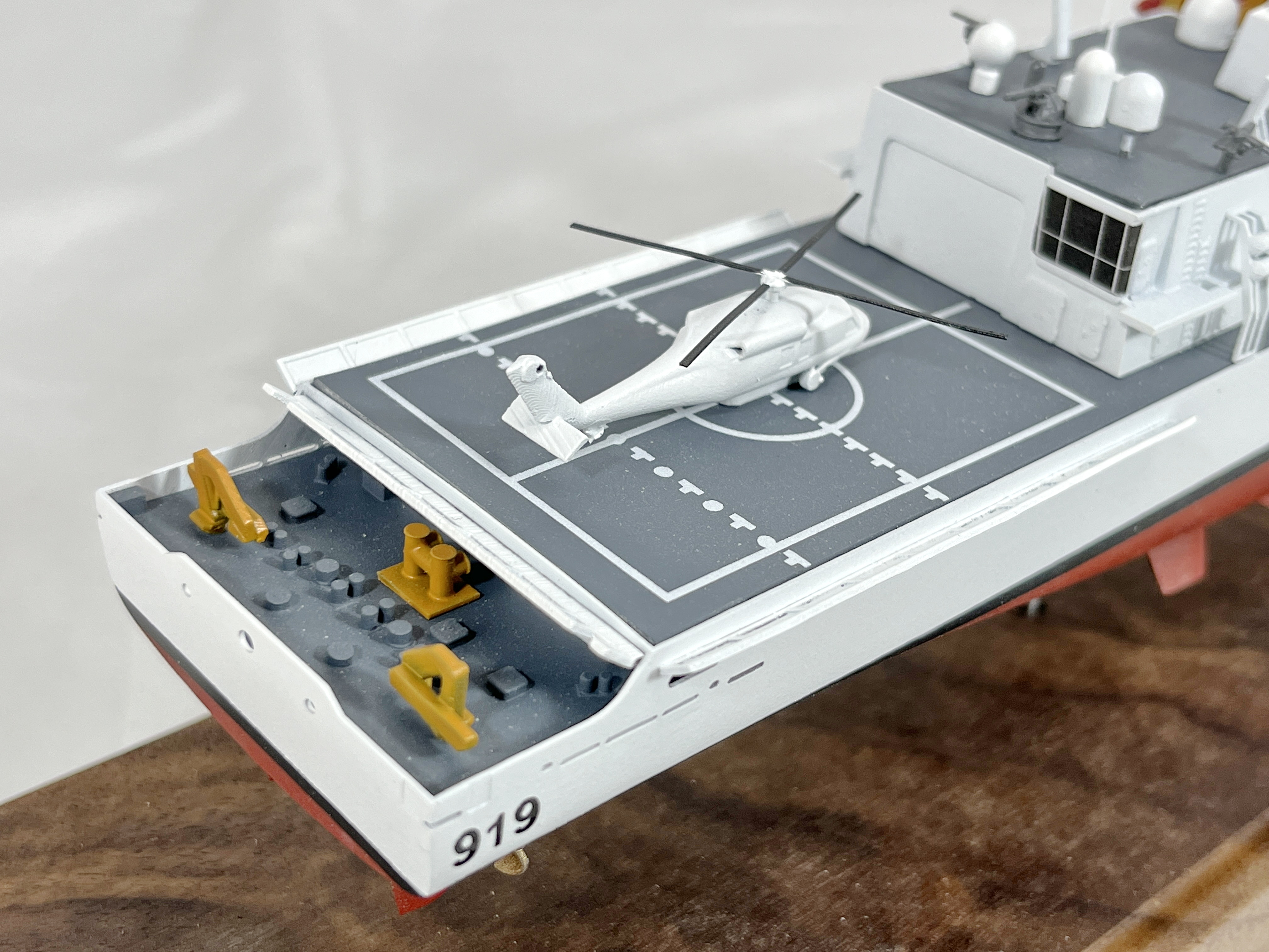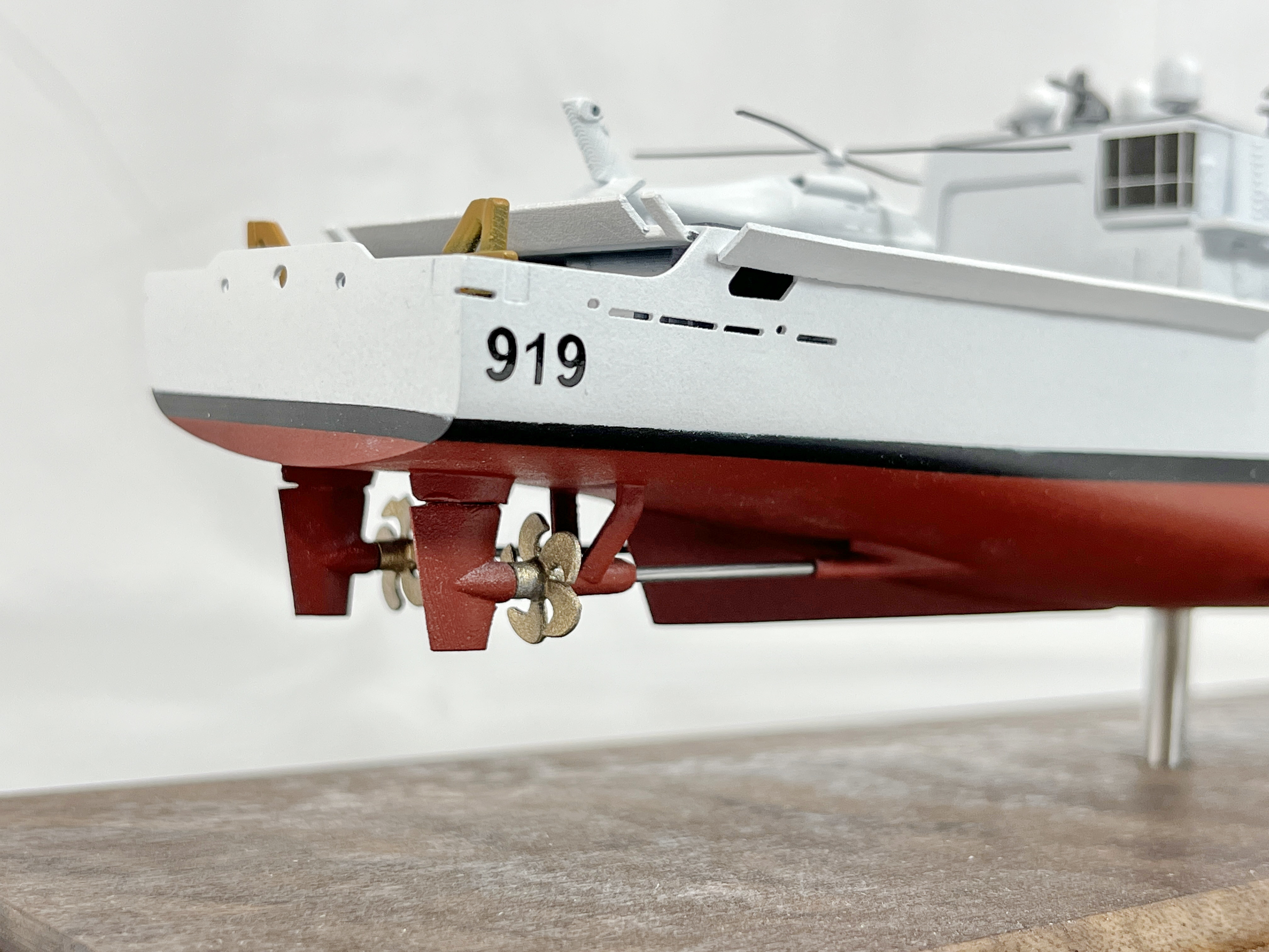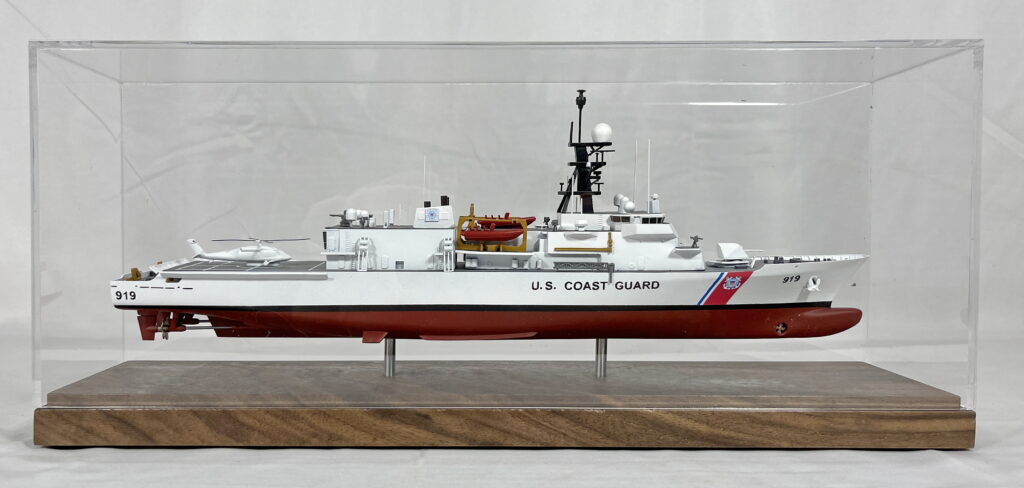 KiwiMill built 10 of these small Coast Guard Cutter desktop models. Each Coast Guard model was mounted on a Walnut base and included a clear dust cover.
