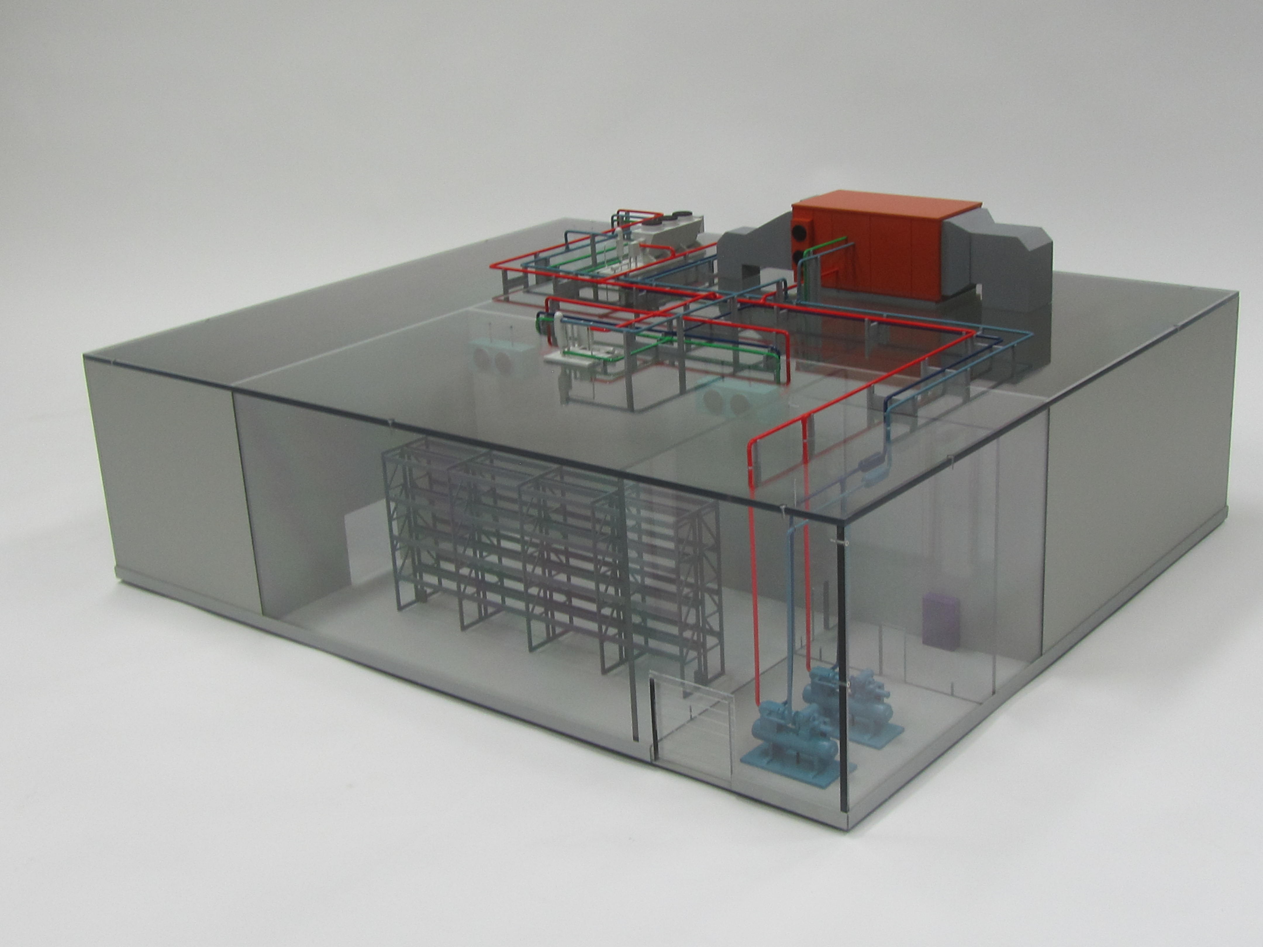 This cooling system model is a simplified display of a refrigerated production facility. The purpose of the model was to highlight the client’s piping system, shown in bright colors. The rest of the equipment was made into simple, easily identified shapes and painted grey to minimize distractions.