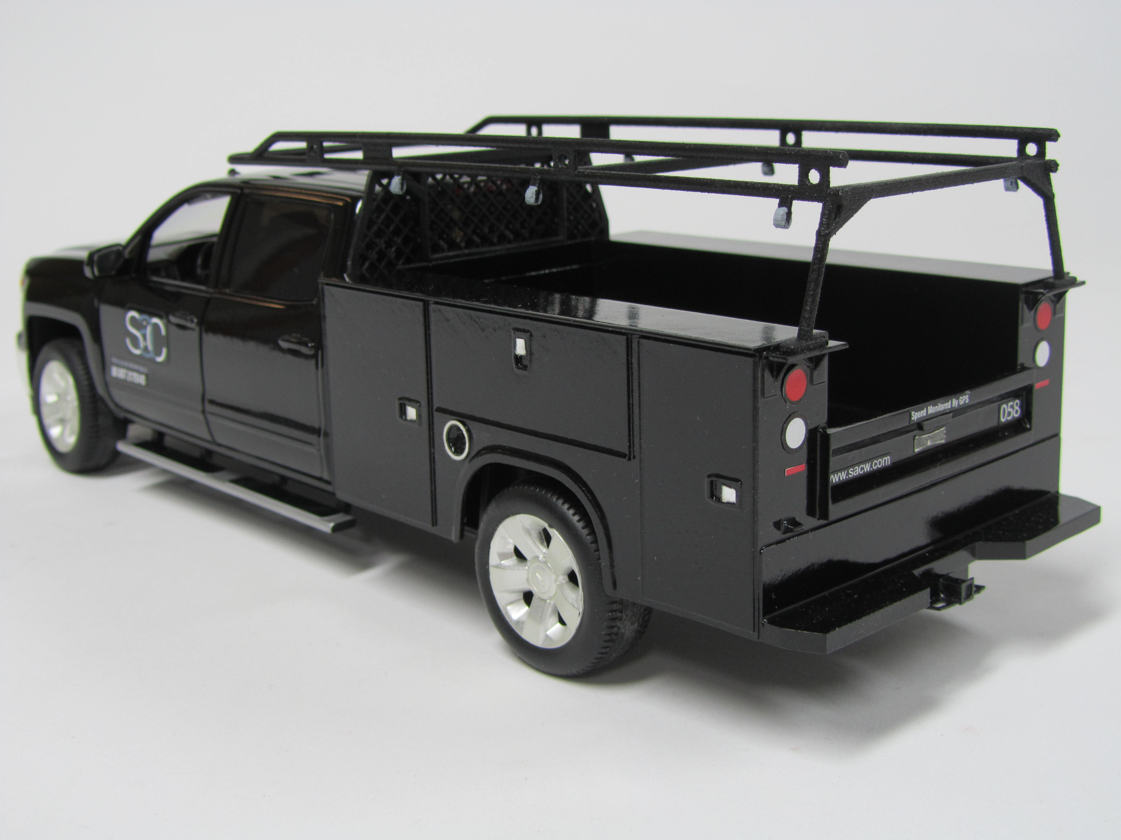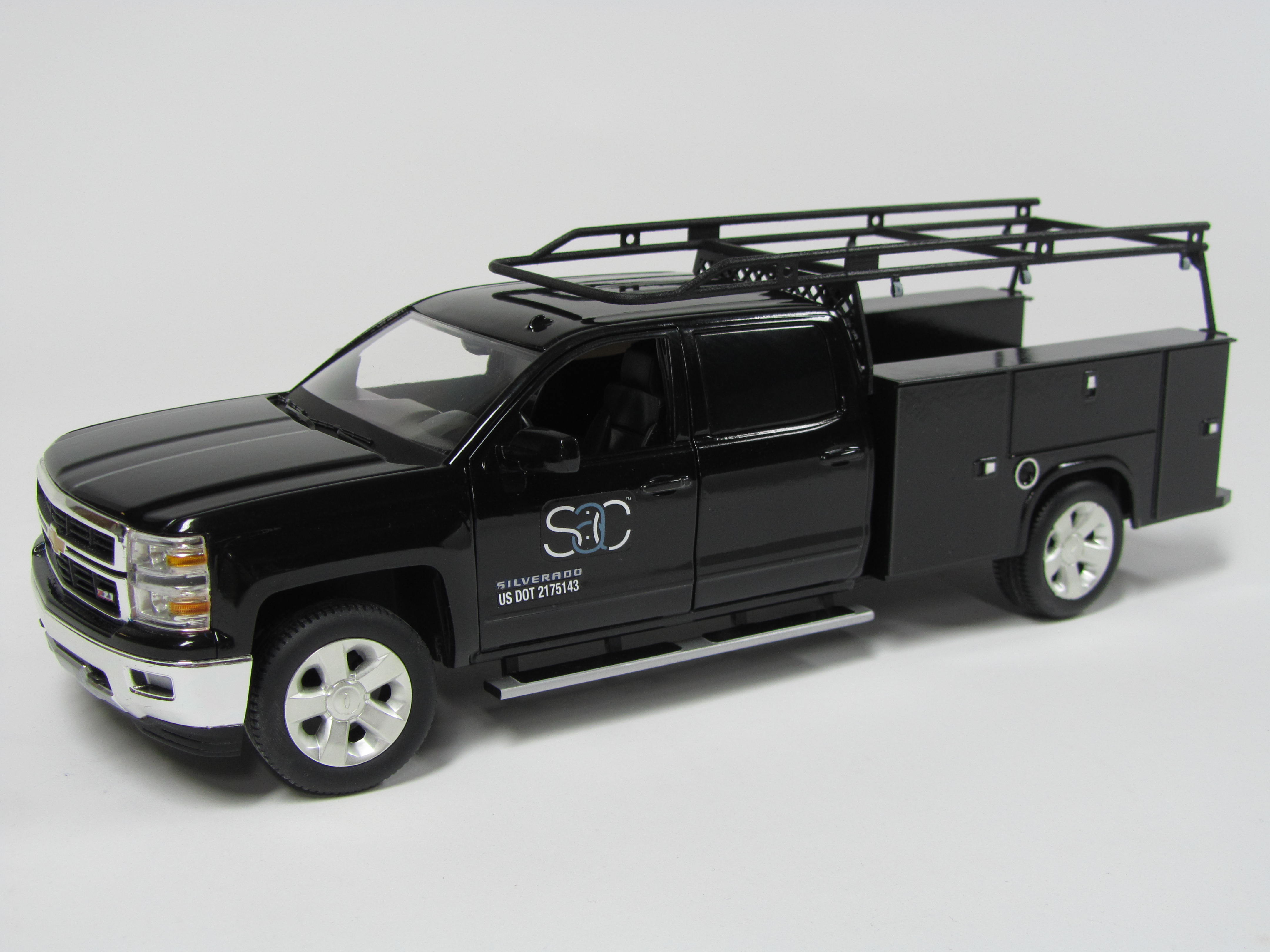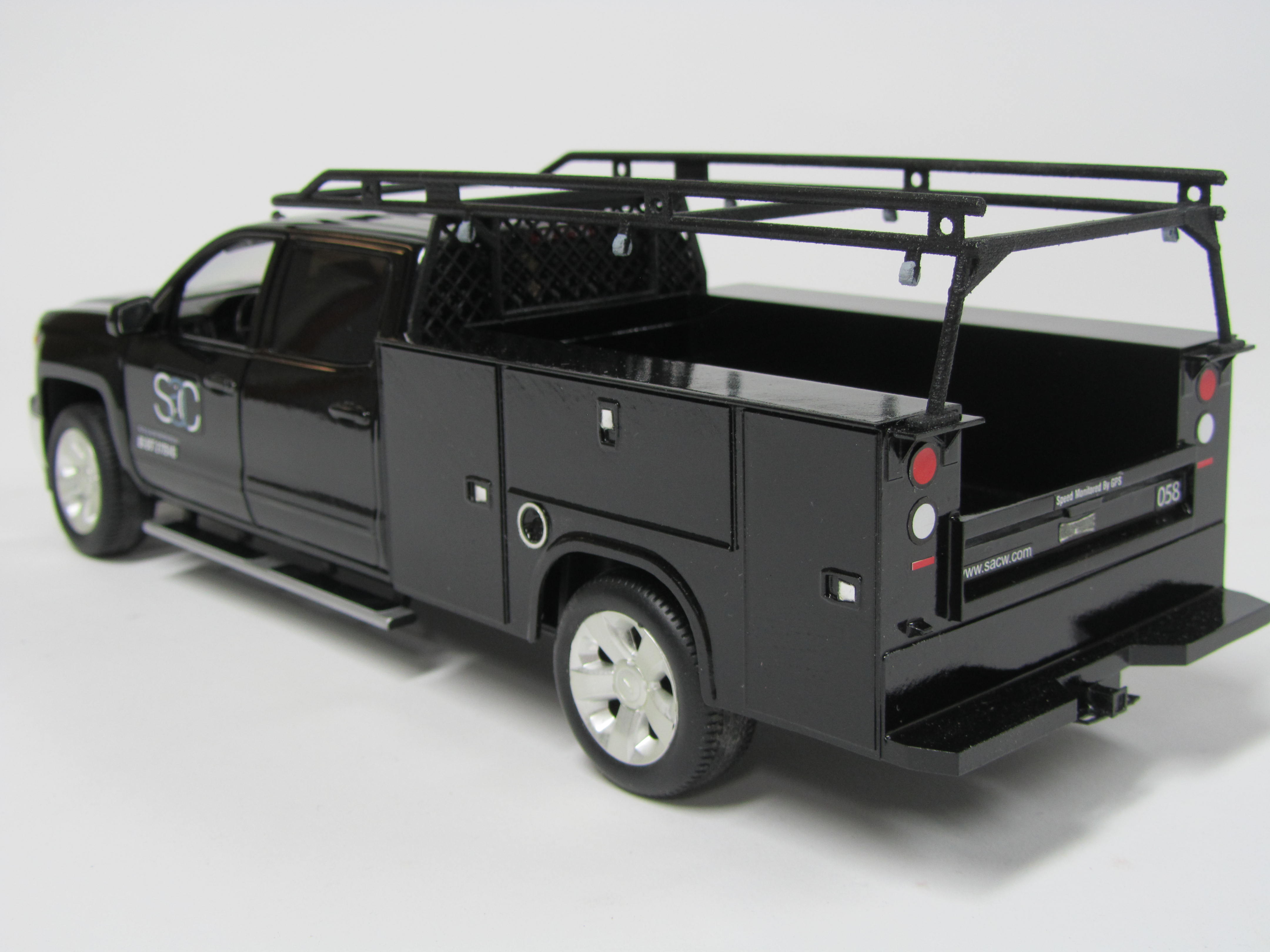 The off-the-shelf diecast truck was taken completely apart by our model makers and repainted. Then 3D printed parts were added to customize the back end of the truck and create a ladder rack. Miniature decals were added to the finished product.