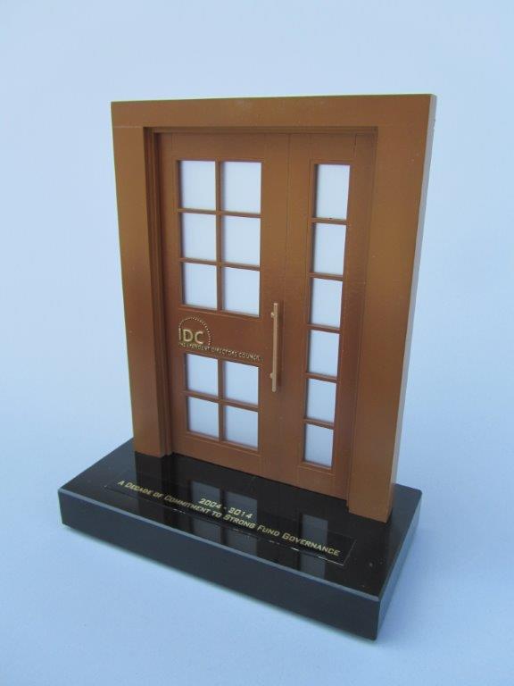 The laser cut doors have hand painted handles and logo relief work. The door models are mounted on to acrylic bases with client-provided labels.