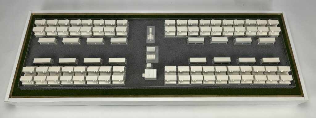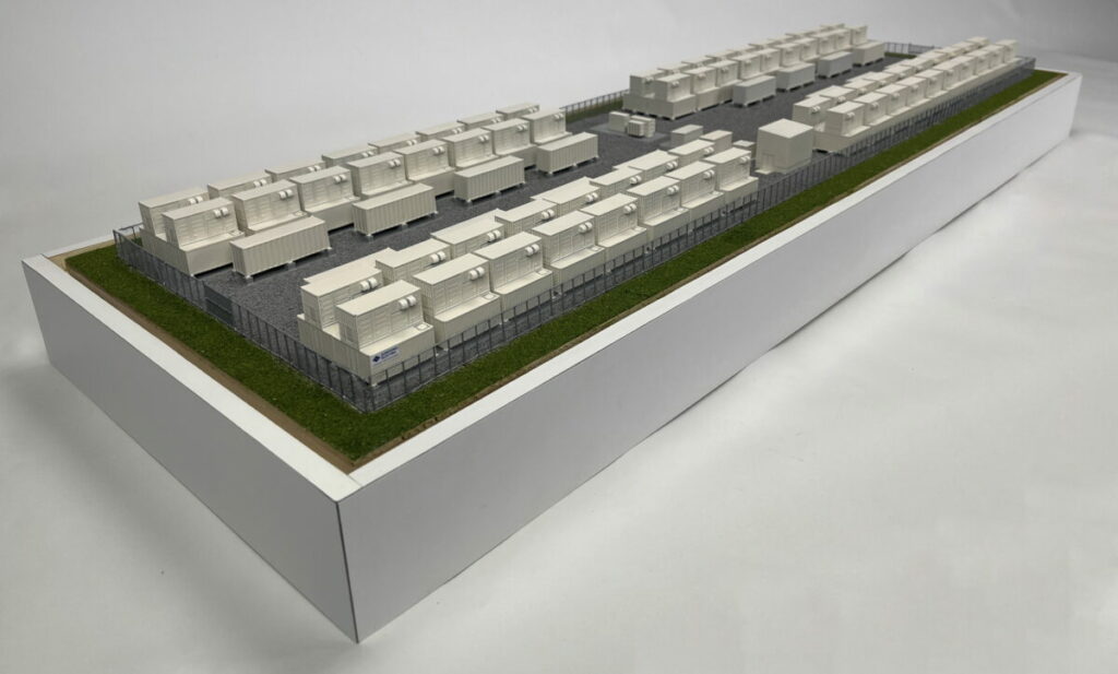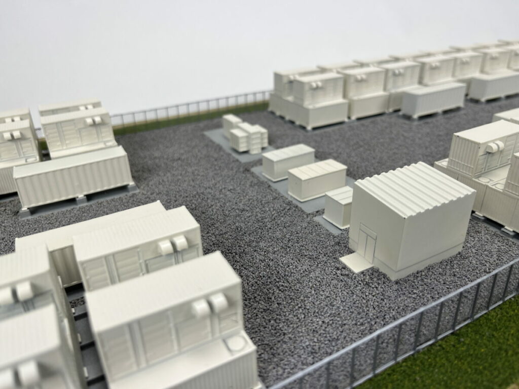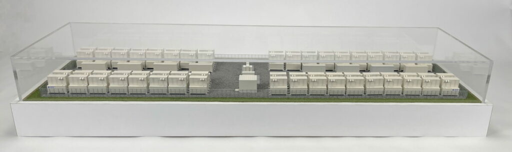 This scale model of a redox flow battery installation that measures approximately 36″ x 12″ and includes a clear dust cover.