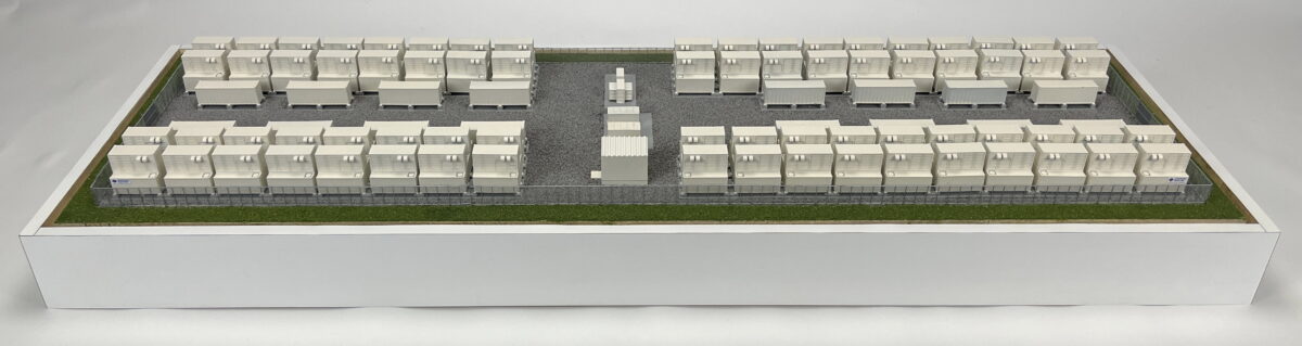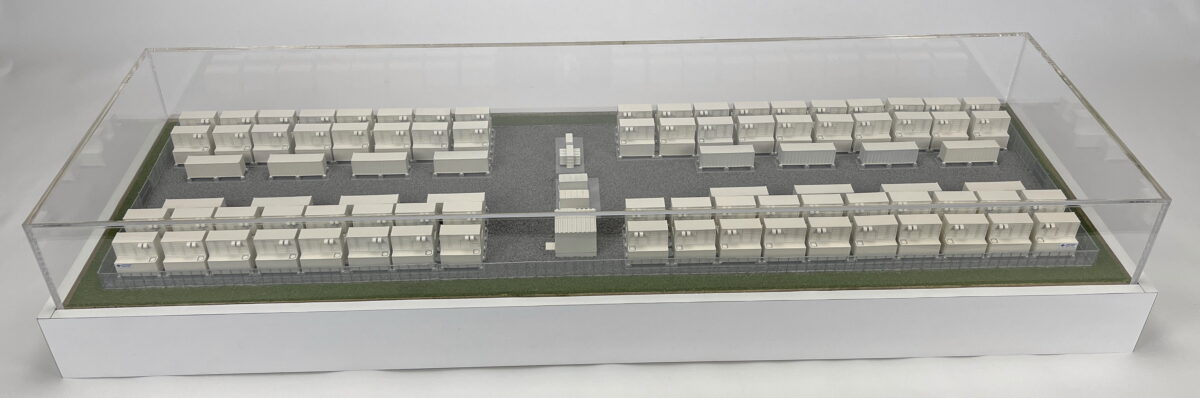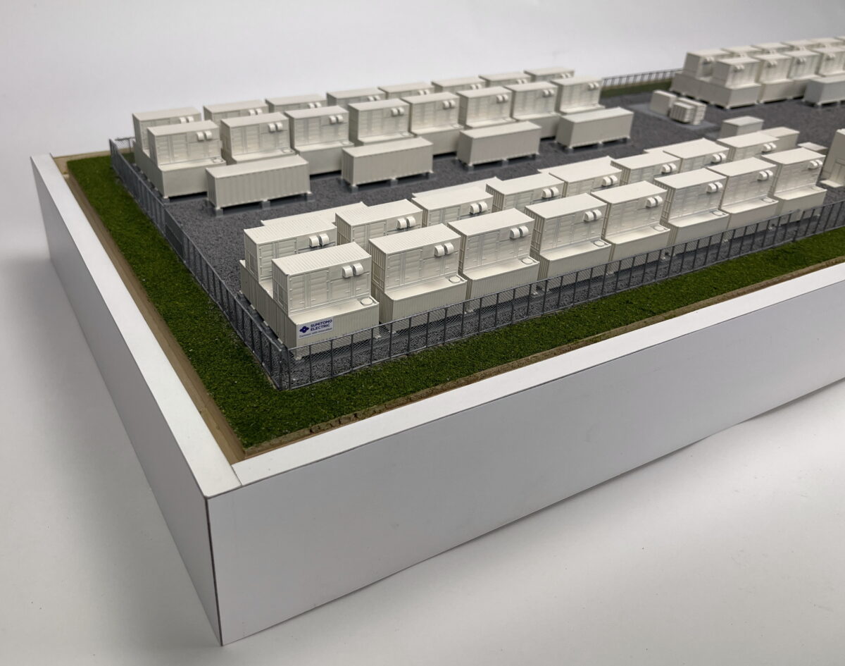 This scale model of a redox flow battery installation that measures approximately 36″ x 12″ and includes a clear dust cover.