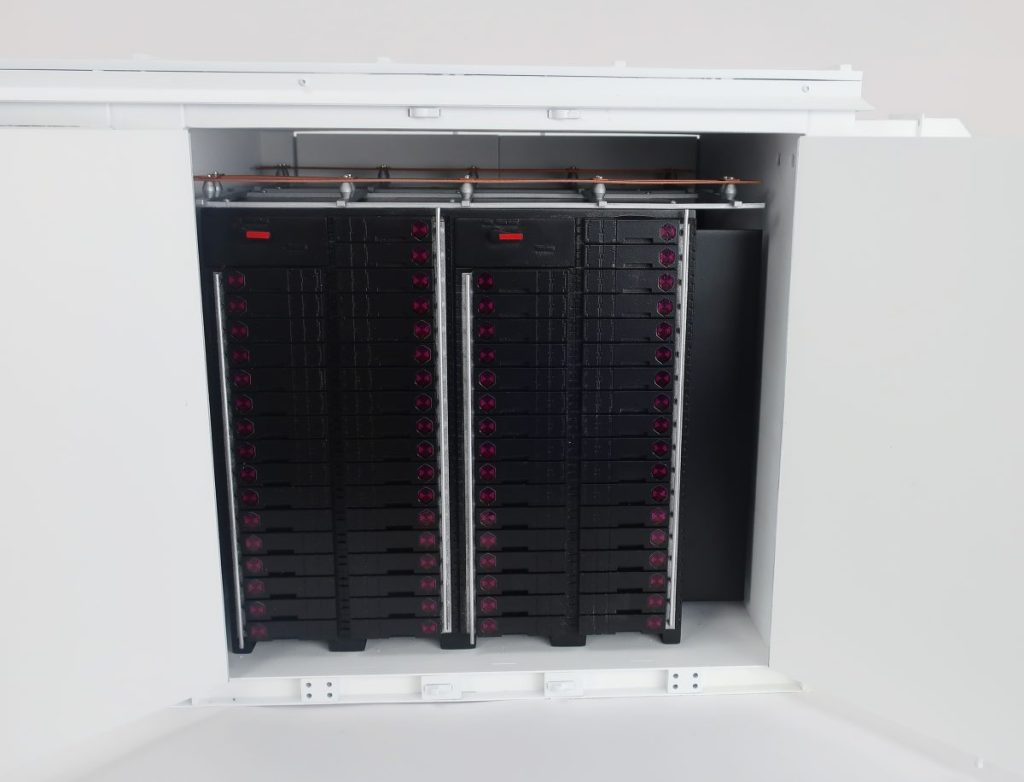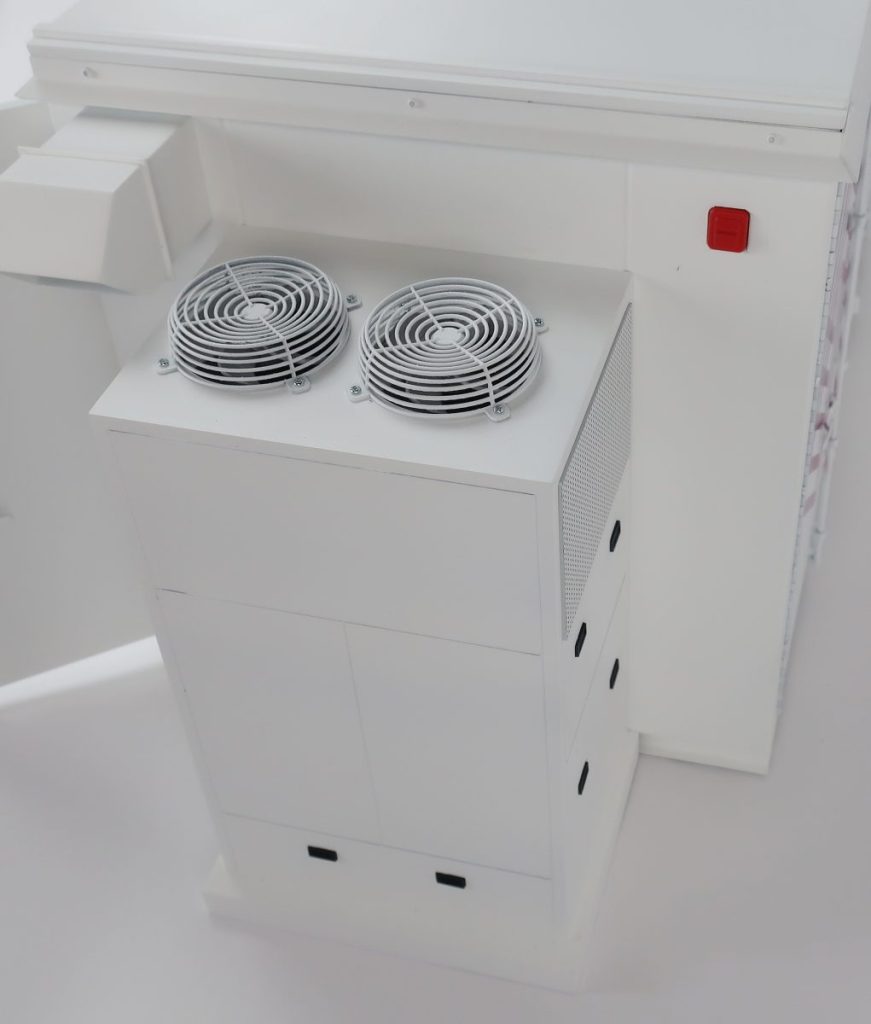 This energy storage model was built to demonstrate out customer’s product at trade shows and sales presentations. This is the larger of two unites we built for them. The model is about 36″ wide x 12″ tall and includes functioning doors on both sides of the model to show the detailed interior highlighting their product.