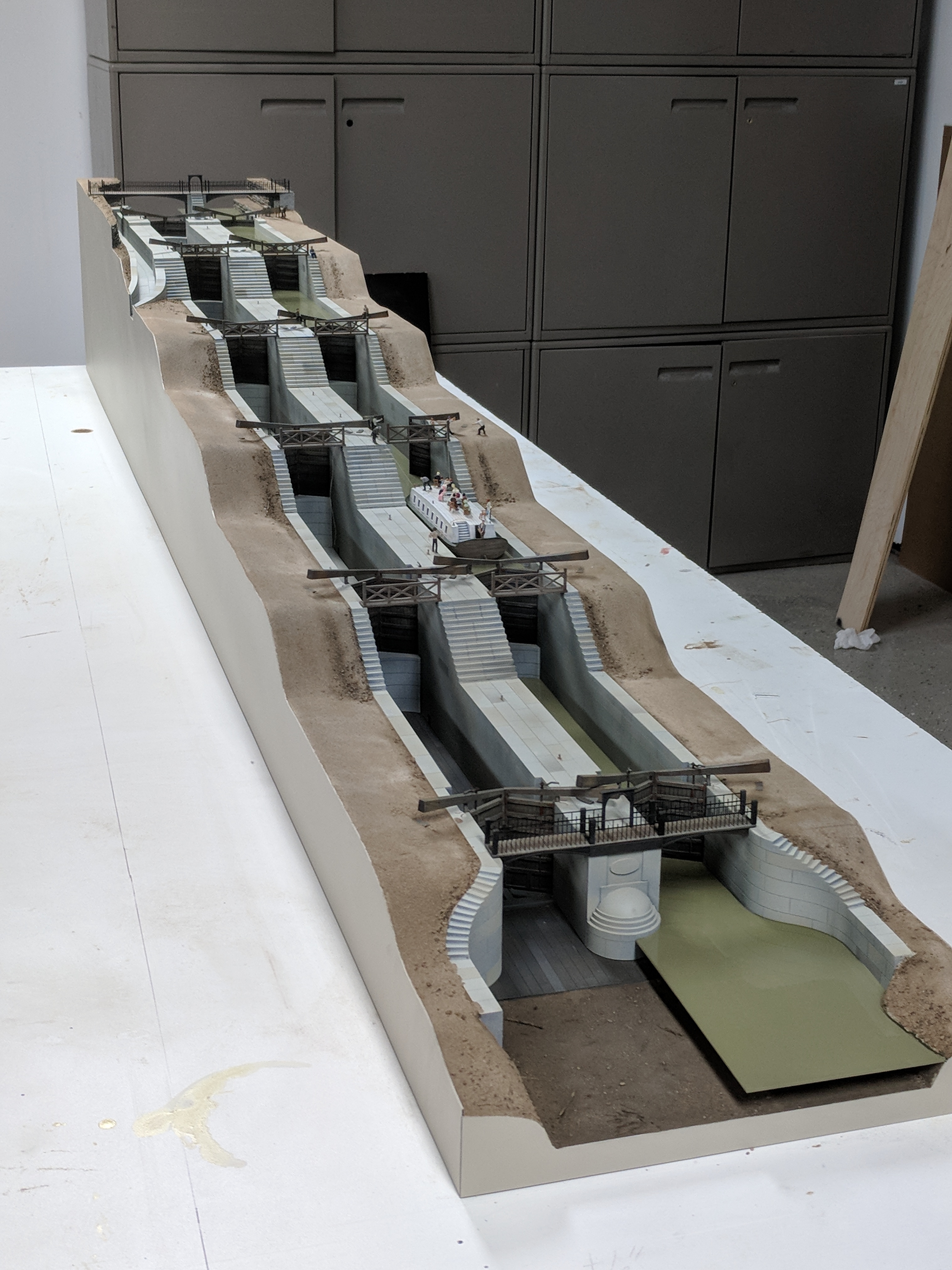 This canal model was built for a museum display. The site model depicts a set of working locks. A lock is a device used for raising and lowering boats, ships and other watercraft between stretches of water of different levels on river or canal waterways. This lock system was called the Flight of Five, and existed in the 1830’s in Lockport, New York. They were part of the Erie Canal that runs through NYS.