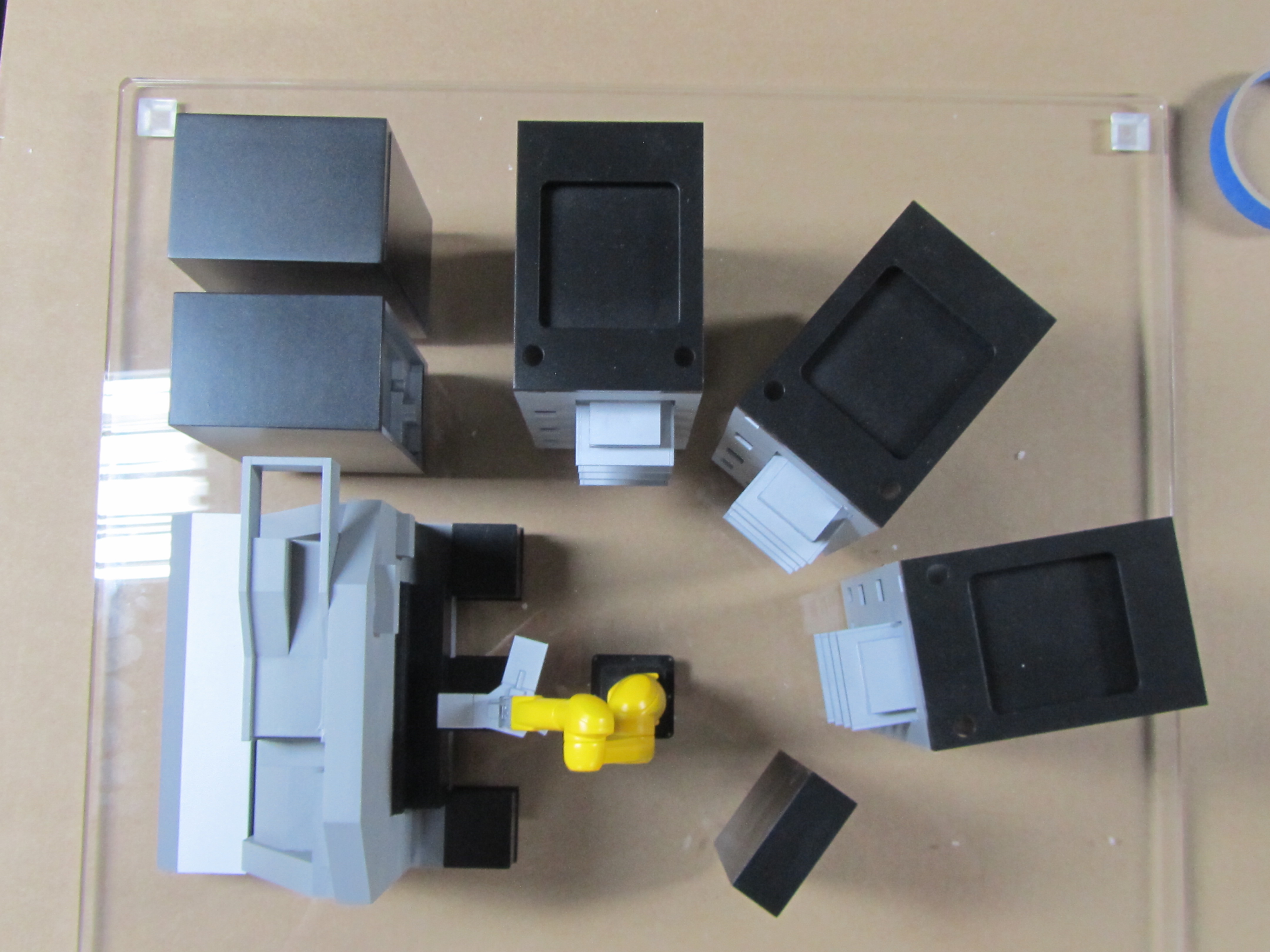 The gene sequencing model was made from 3D printed parts, machinist board and sheet plastics. It was shipped directly to a trade show to be displayed on a table lit from below. The whole model fits nicely inside a large Pelican case for ease of travel.