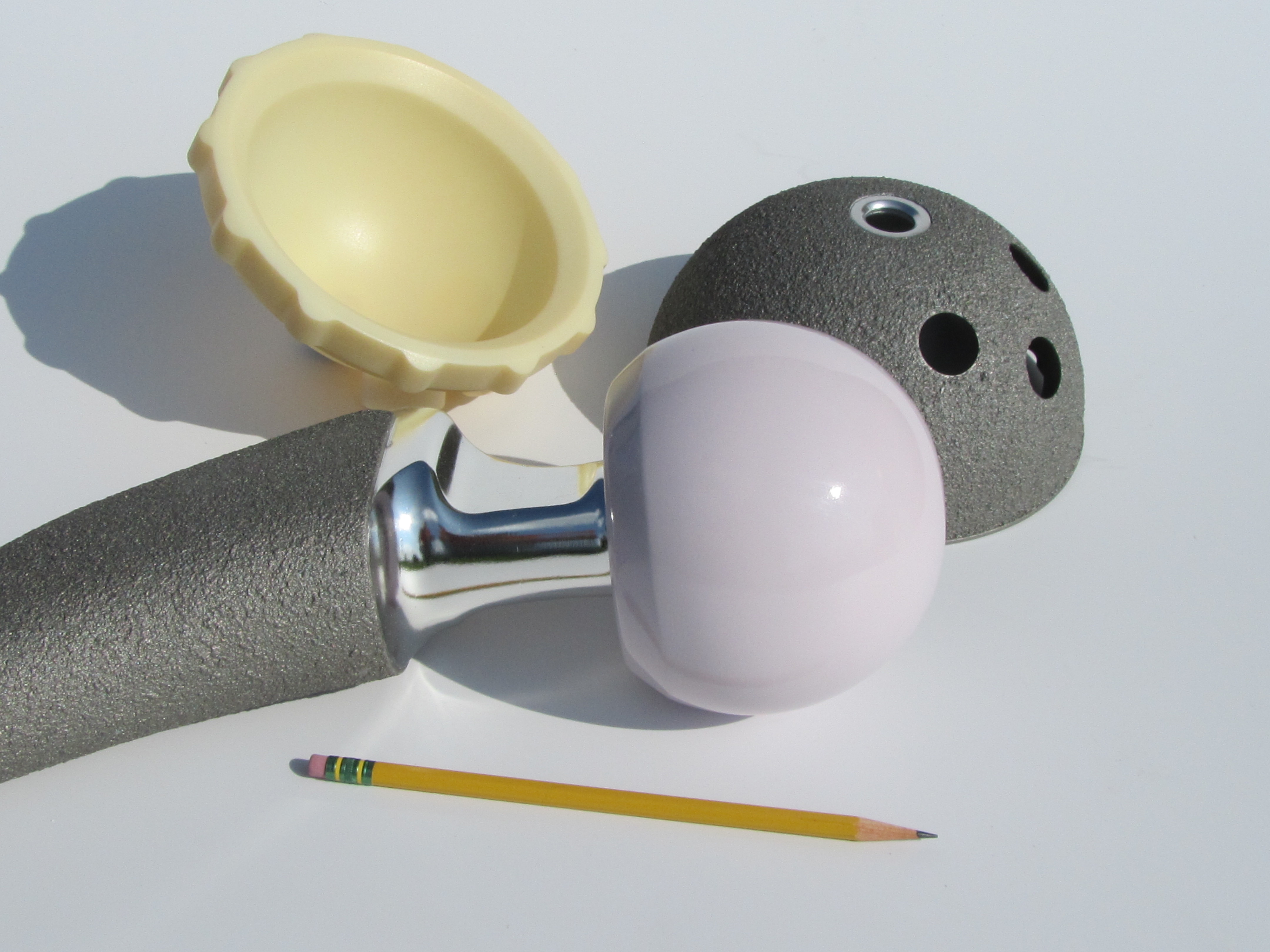 This hip implant model is 3 1/2 x the size of the real implant. This human friendly scale shows off the design and features of the model to potential customers at trade shows.