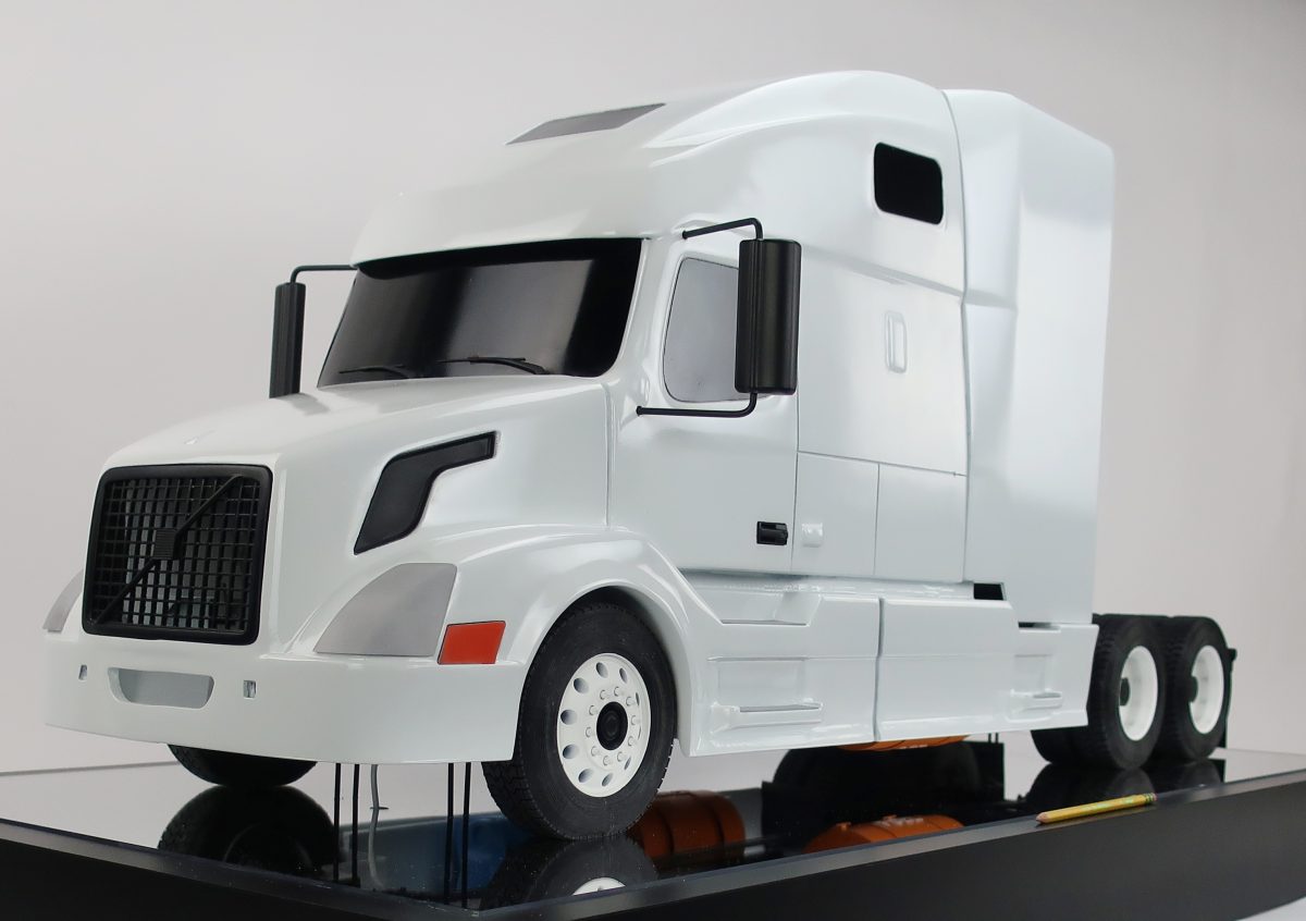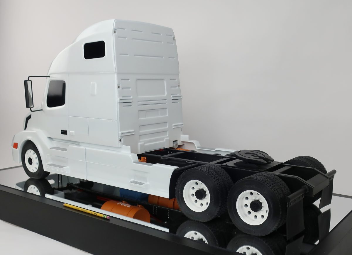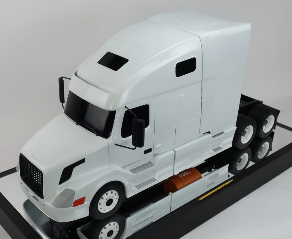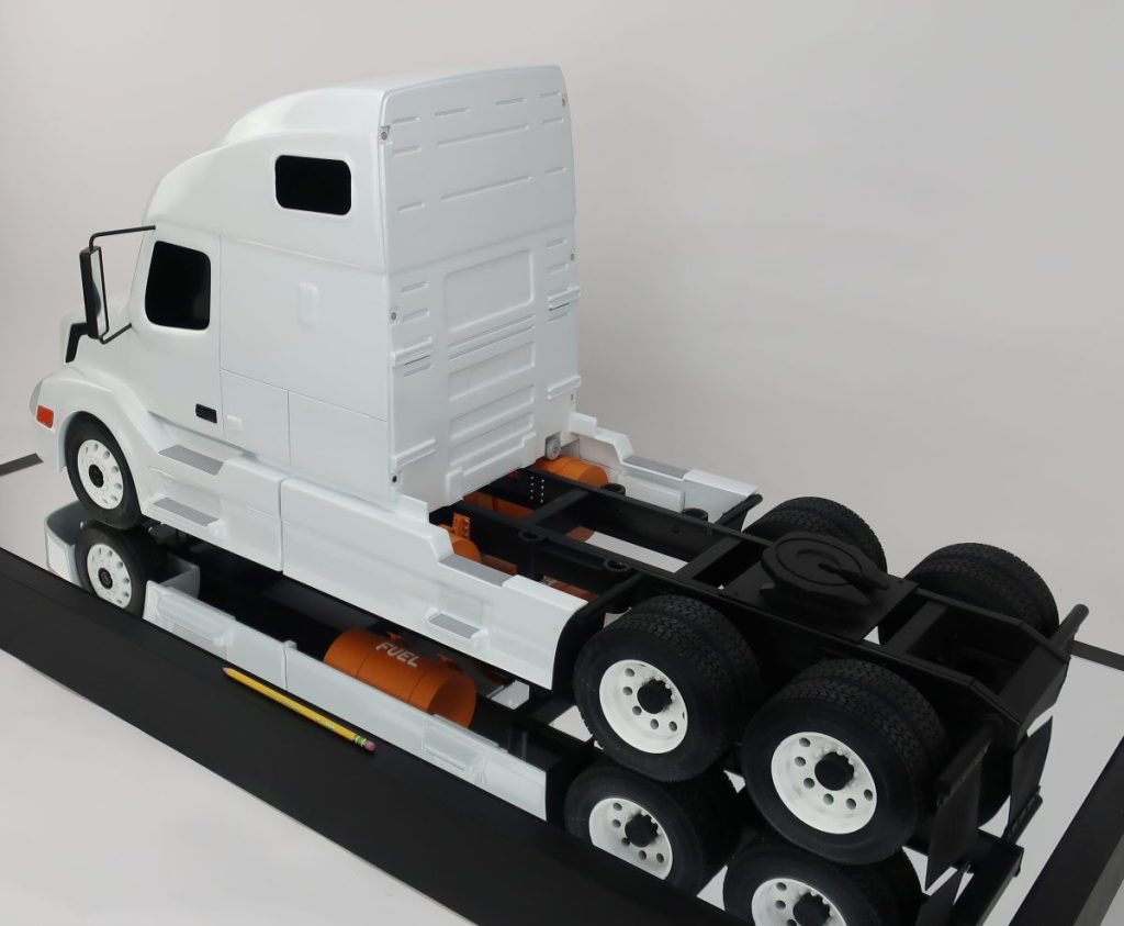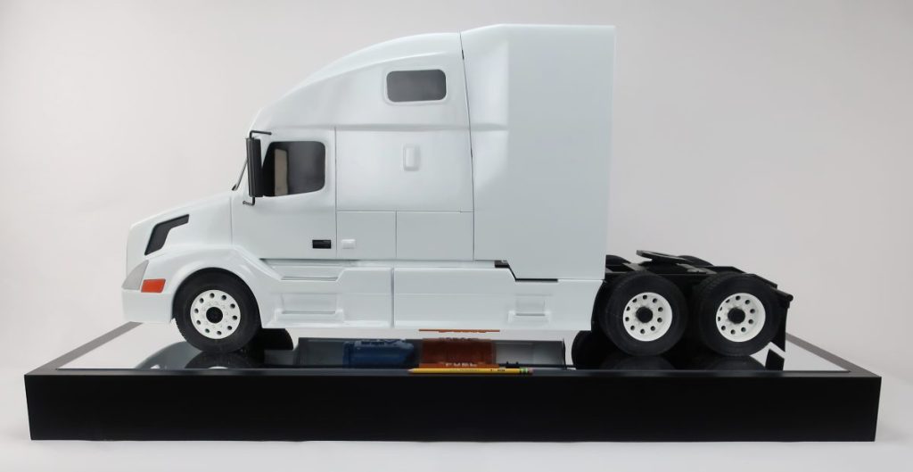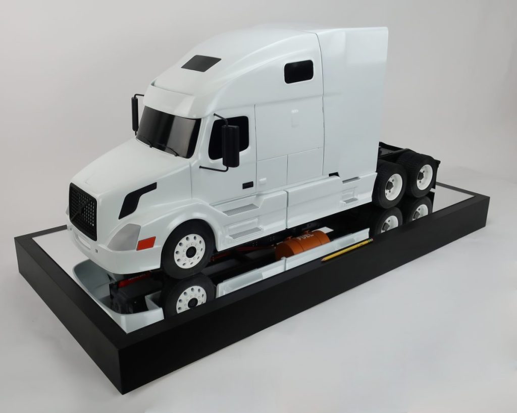 This truck model measures 44″ long and 20″ tall. The entire cab is removable to see the engine as is the shroud behind the cab. Our customer has a proprietary piece of equipment (not shown) that resides underneath the shroud.