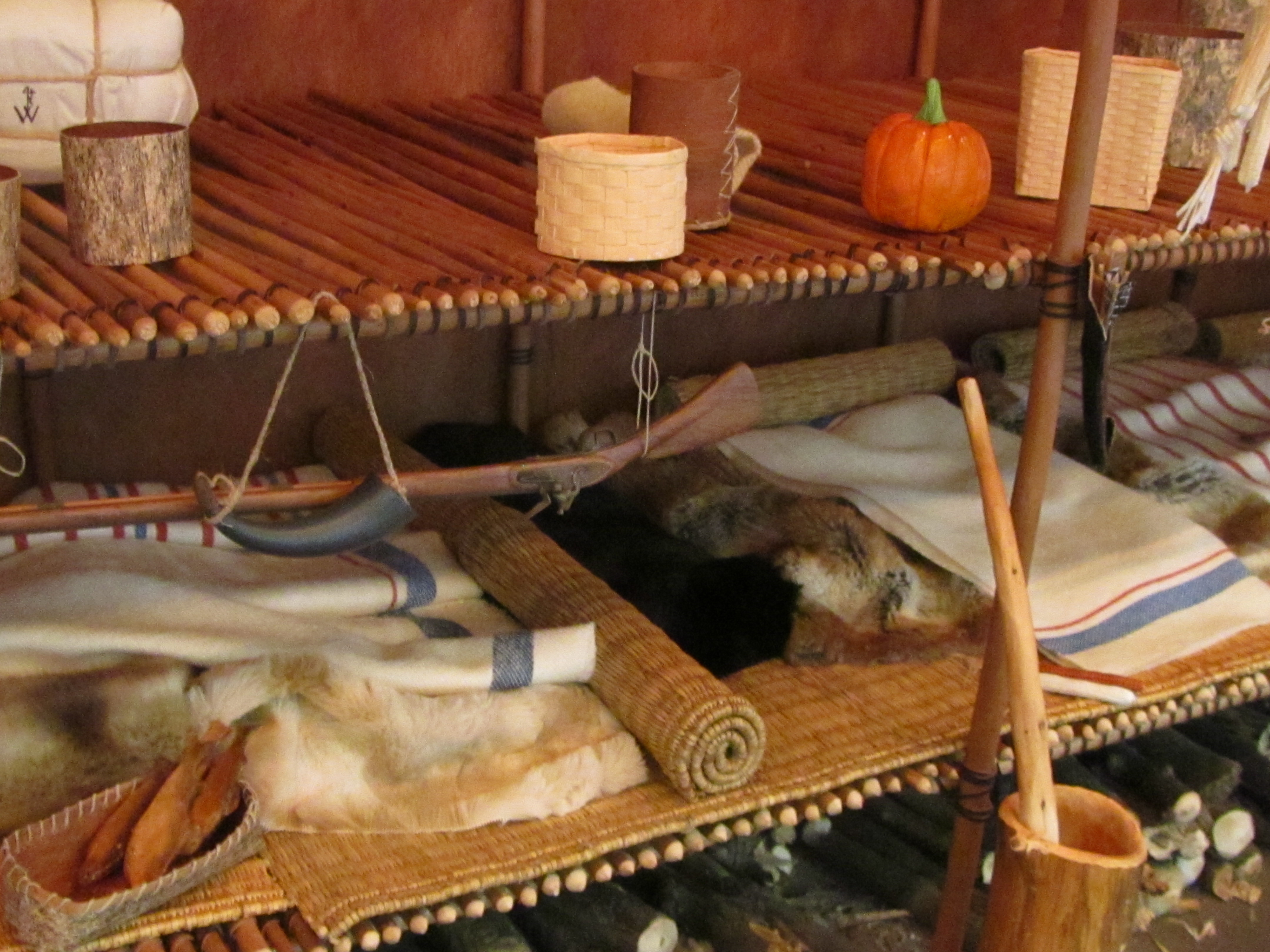 Once the actual structure of the longhouse replica was decided, the objects inside were hand built in the shop. Small scale ladders, platform beds, and tiny tools, weapons and lacrosse sticks were made out of natural materials.