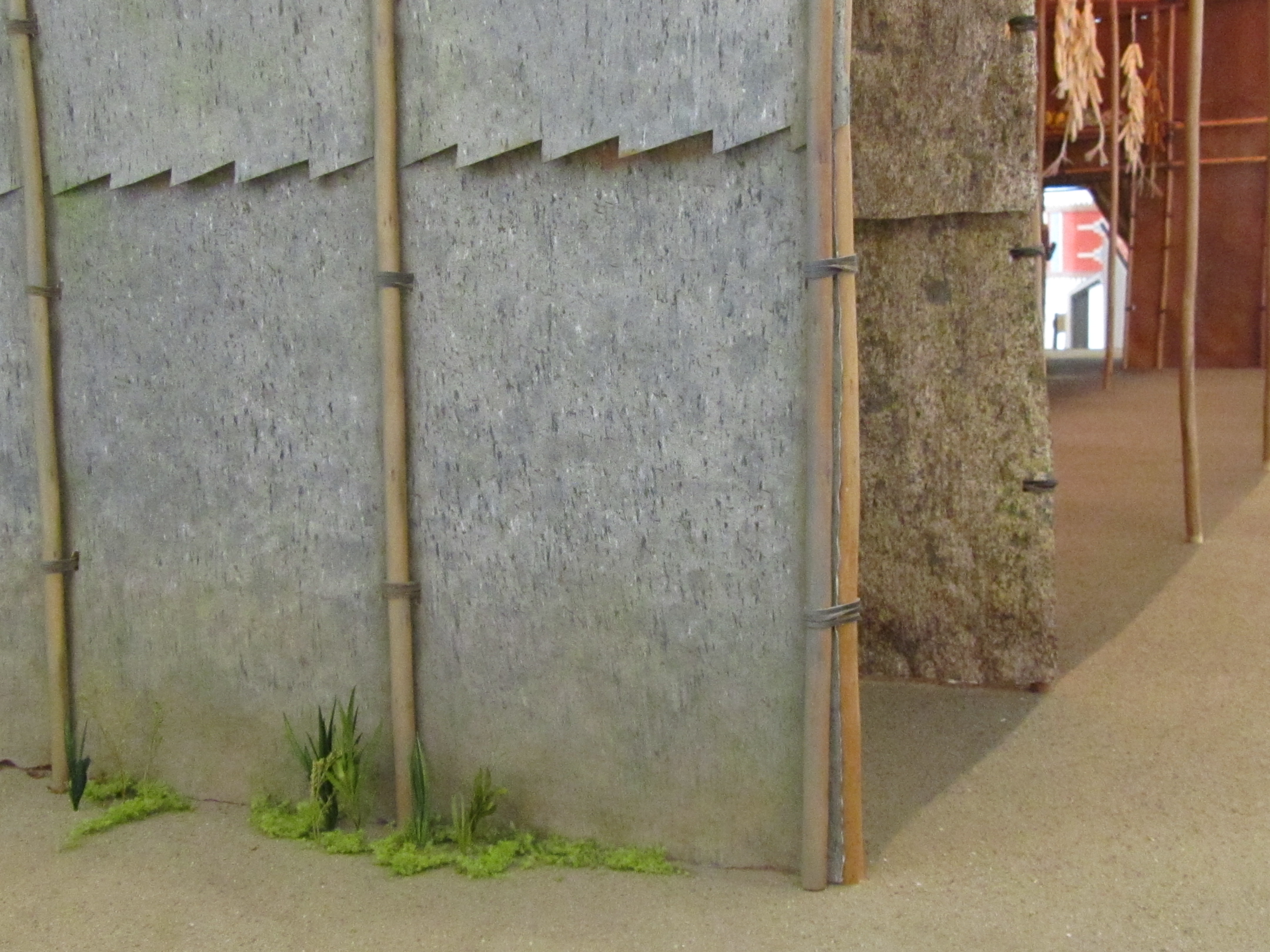 Our model makers chose a heavy weight handmade paper, which was dyed in house, to replicate the bark of the longhouse and imported willow sticks for the frame. Real leather strips were used to tie the frame together, much like the actual longhouse would have been constructed over 300 years ago.