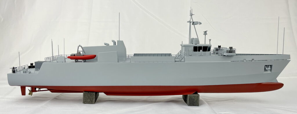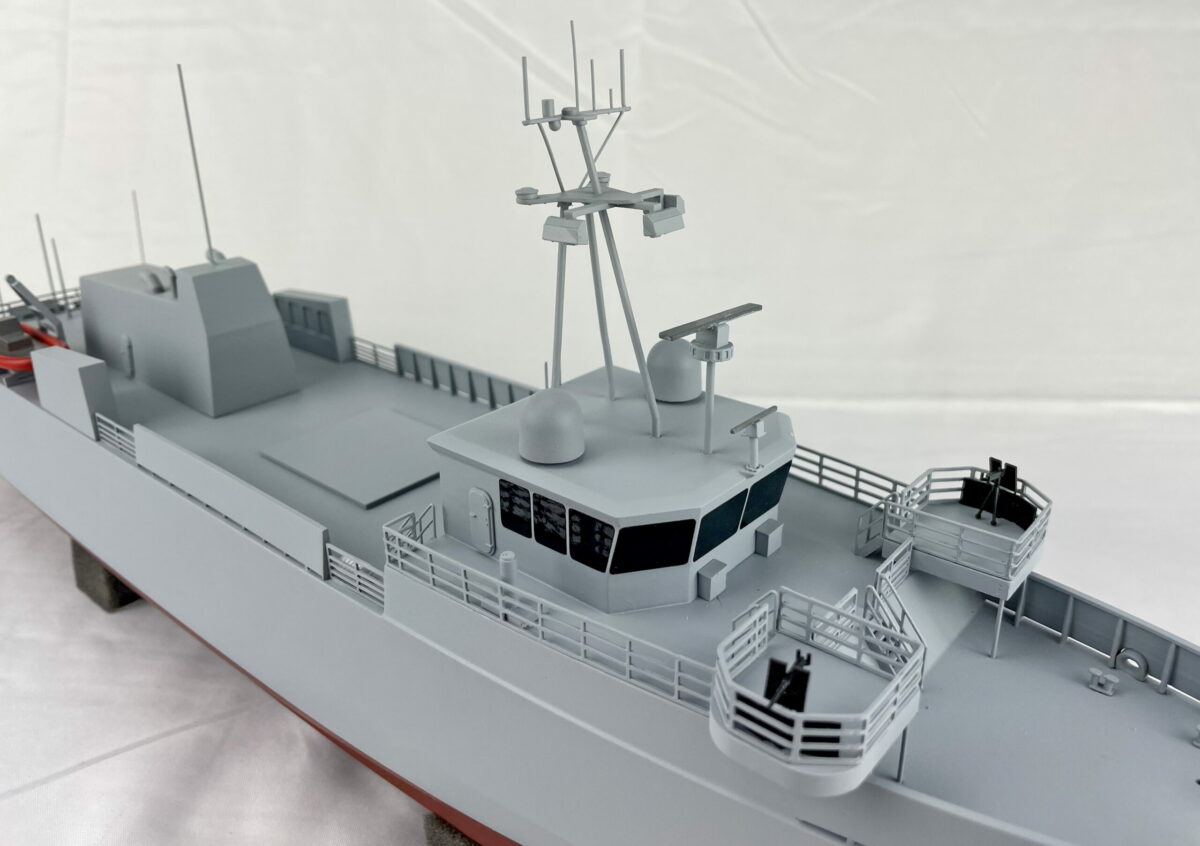 Using the customer provided CAD files, KiwiMill re-draws the entire boat model so the hull can be 3D printed to get an accurate representation of the shape. Details are modeled in CAD and then either hand-built, laser cut out of metal or 3D printed. All of the details are fine sanded and painted to customer specifications.