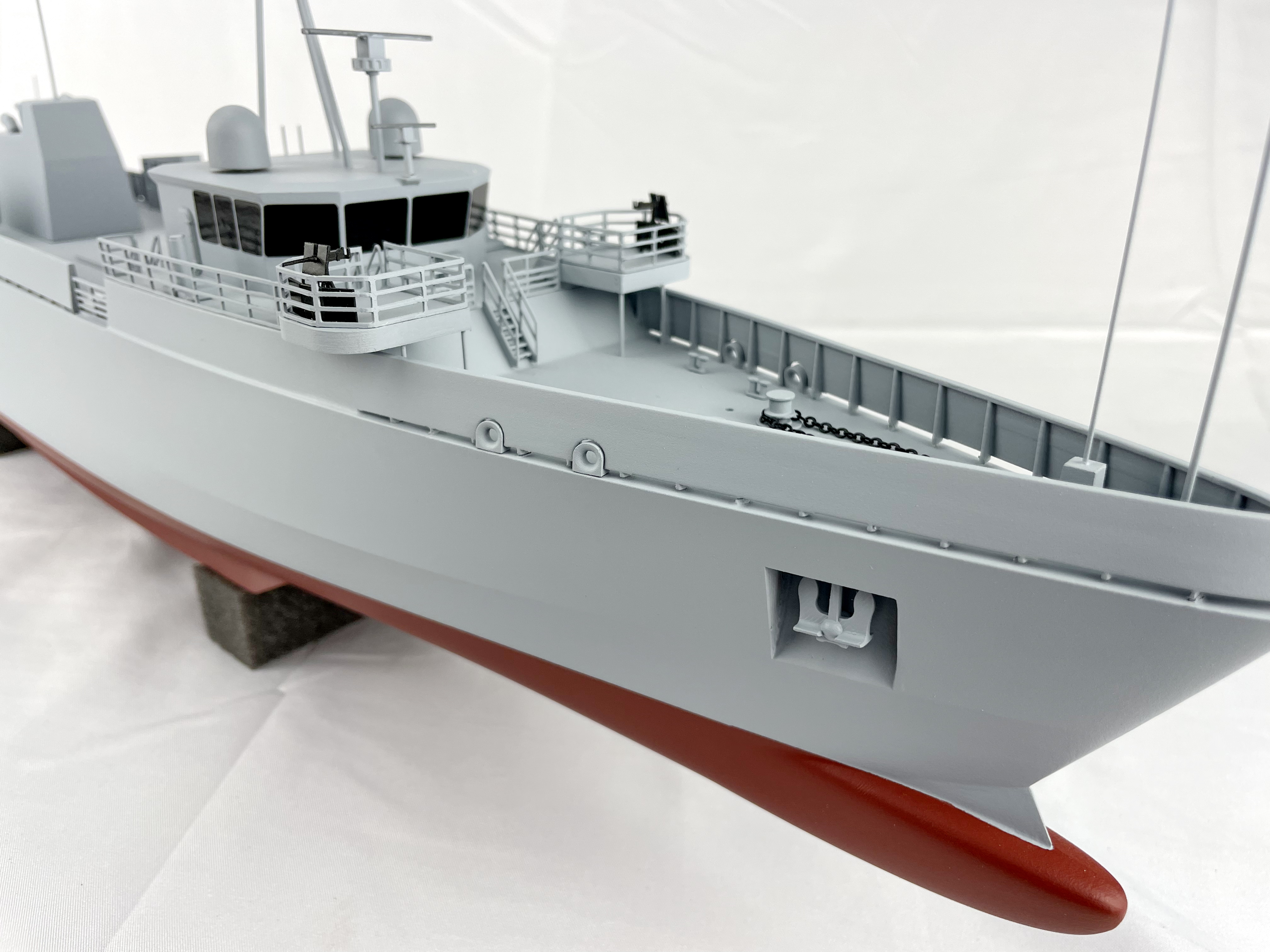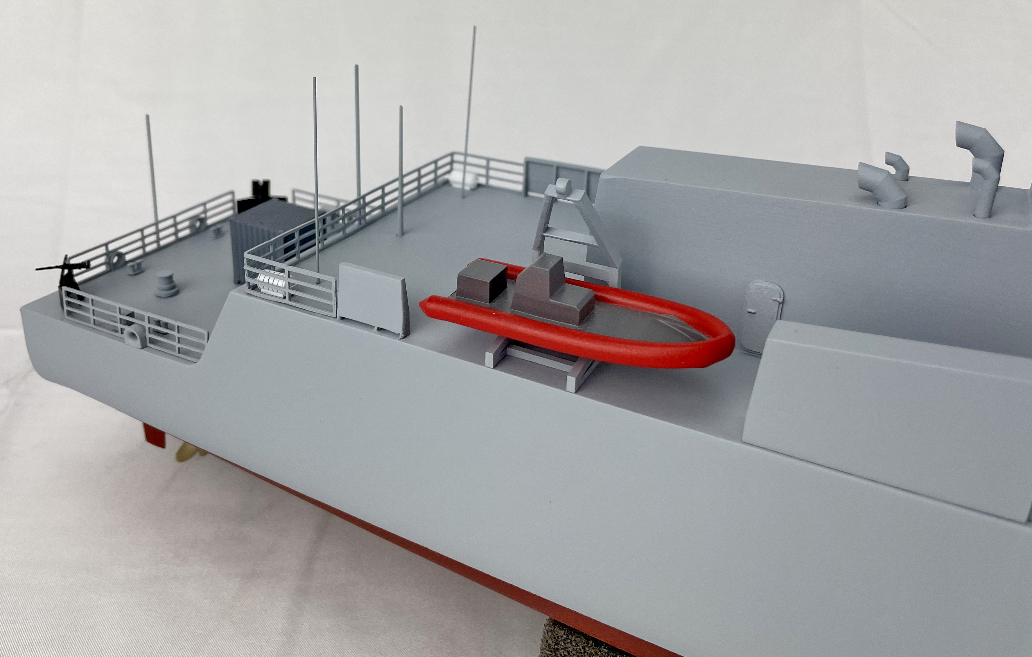 Using the customer provided CAD files, KiwiMill re-draws the entire boat model so the hull can be 3D printed to get an accurate representation of the shape. Details are modeled in CAD and then either hand-built, laser cut out of metal or 3D printed. All of the details are fine sanded and painted to customer specifications.
