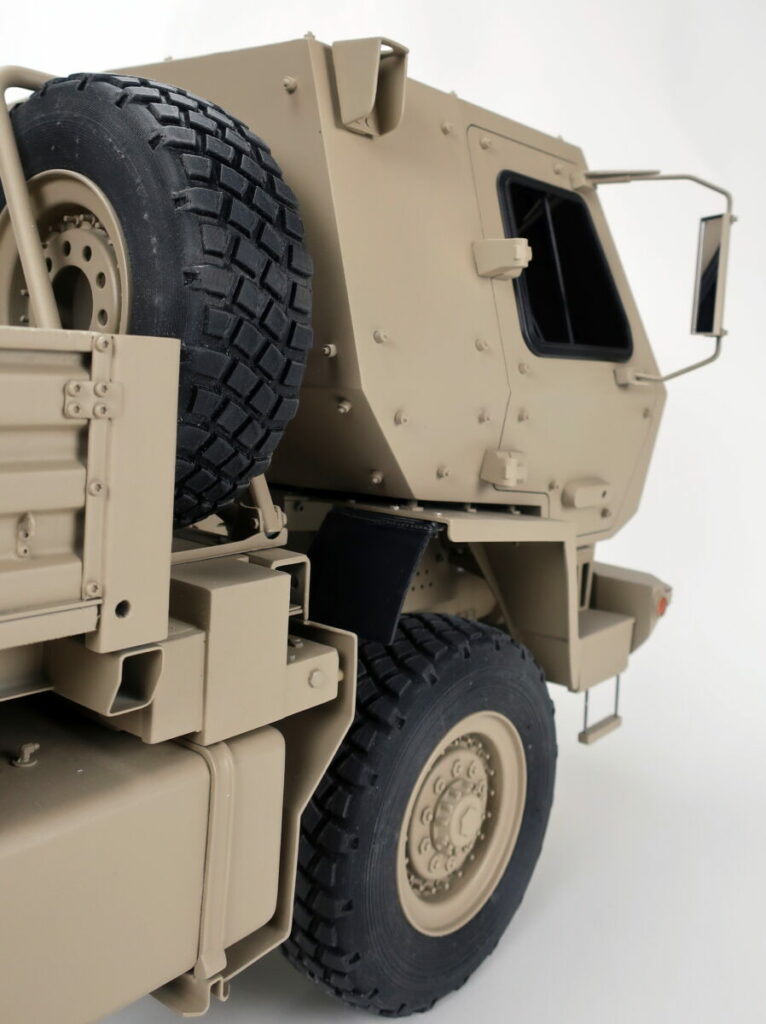 The Oshkosh FMTV 1/8 scale model is one of the most detailed vehicle models we’ve ever built. Every detail is accurate to scale down to the tires, which are rubber and were custom designed and 3D printed specifically for this model. All possible small details were included including the door handles, mirrors, lights, mud flaps, bolt heads, etc. were included. The frame is made out of bent sheet metal to and fastened using over a hundred bolts (as in the actual FMTV). Our ability to design and fabricate using a variety of materials, including sheet metal adds both strength and realism to our models.