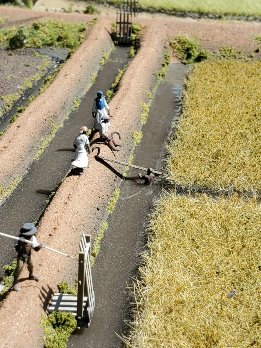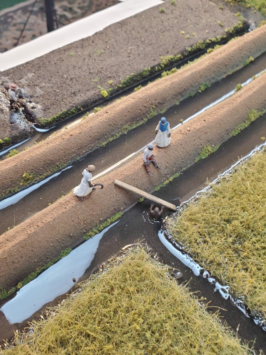 The model shows the seasonal changes of rice tidal fields in the late 1700s and how the fields were worked. A portion of the model shows the hand-processing by slaves of the rice and includes various dioramas of slaves working on the plantation.