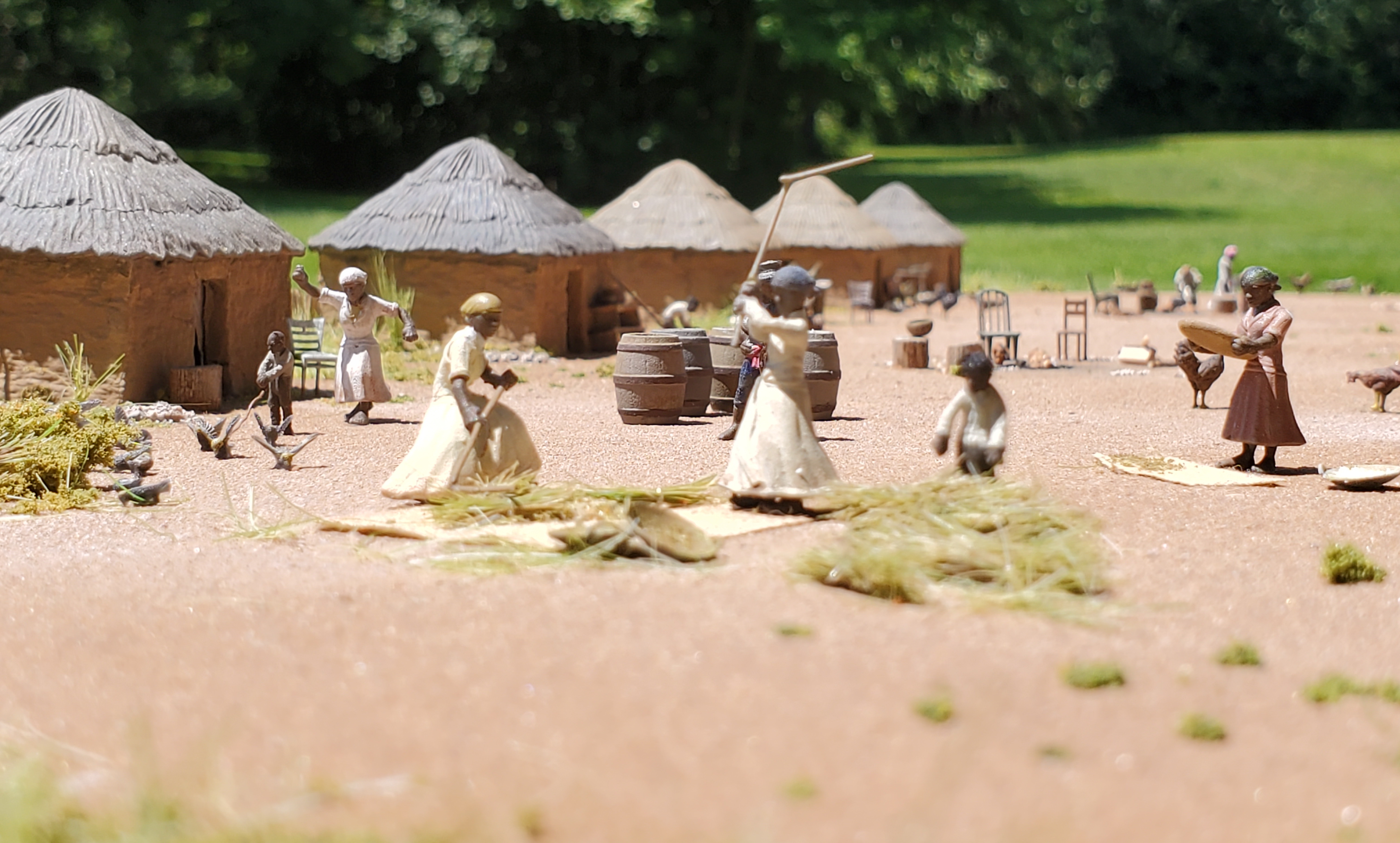 The model shows the seasonal changes of rice tidal fields in the late 1700s and how the fields were worked. A portion of the model shows the hand-processing by slaves of the rice and includes various dioramas of slaves working on the plantation.