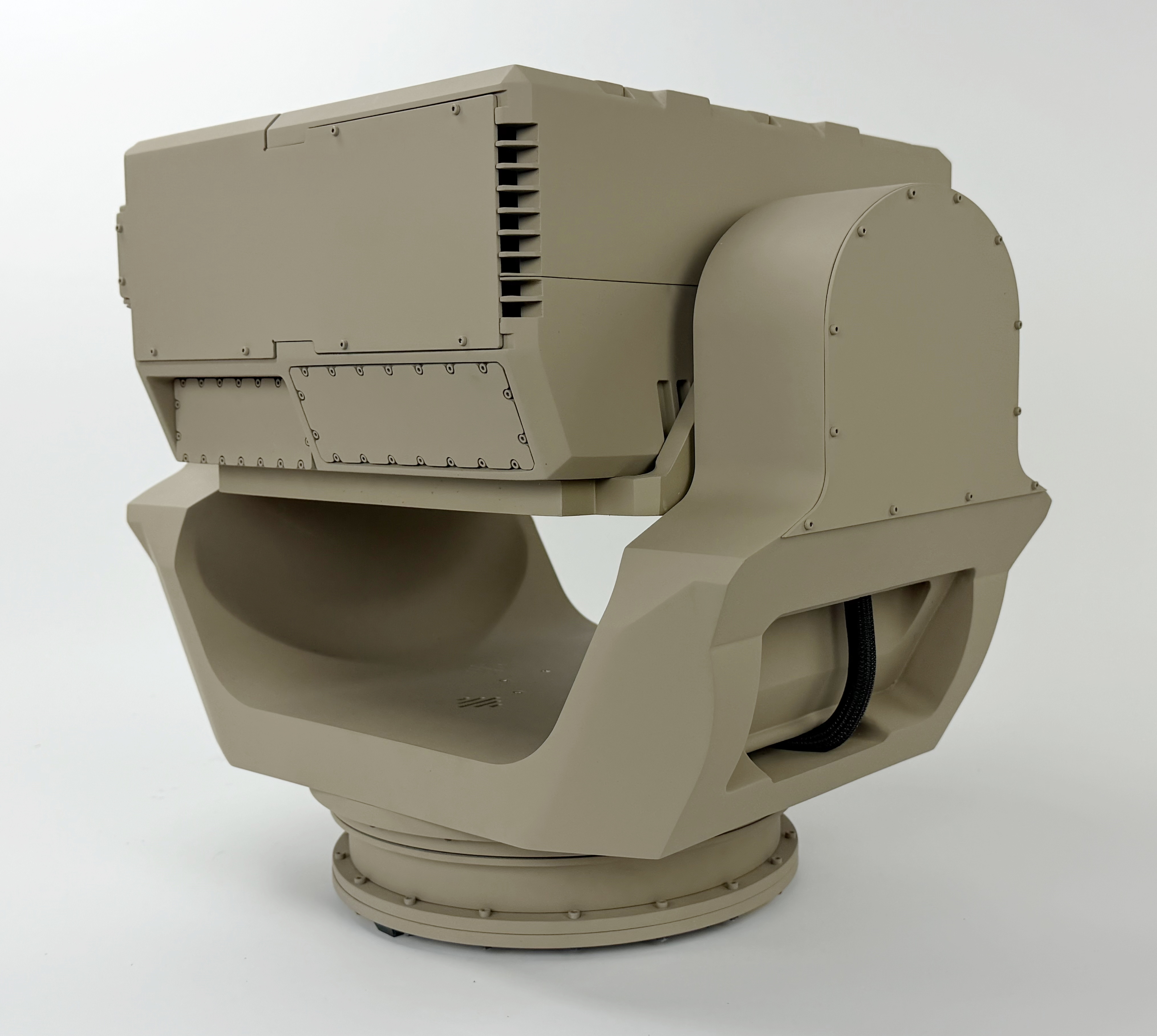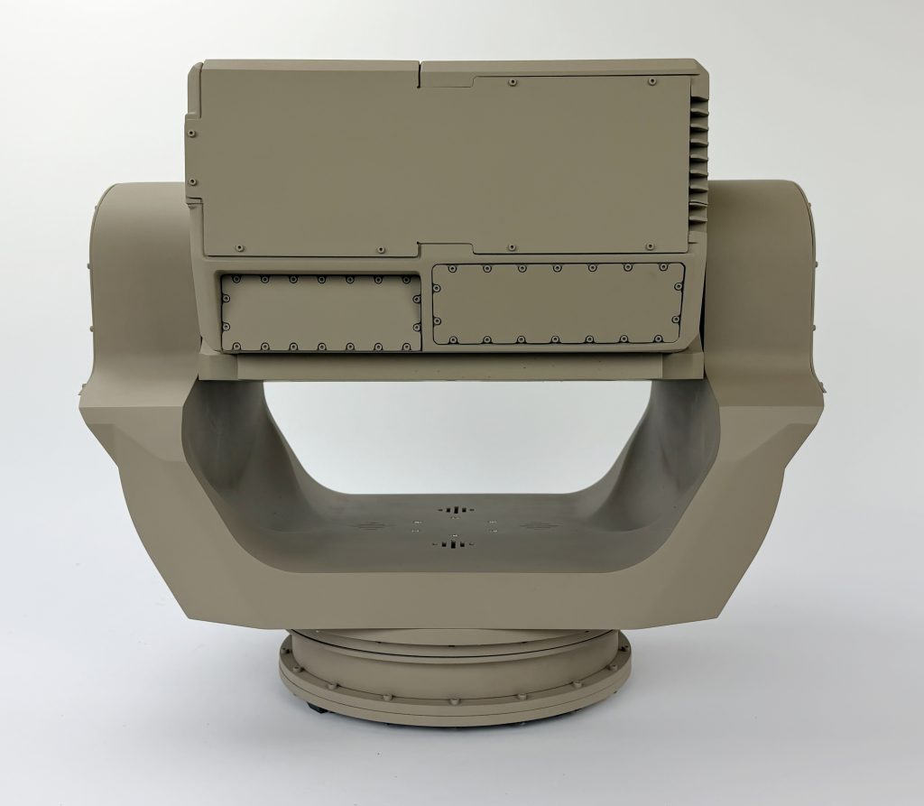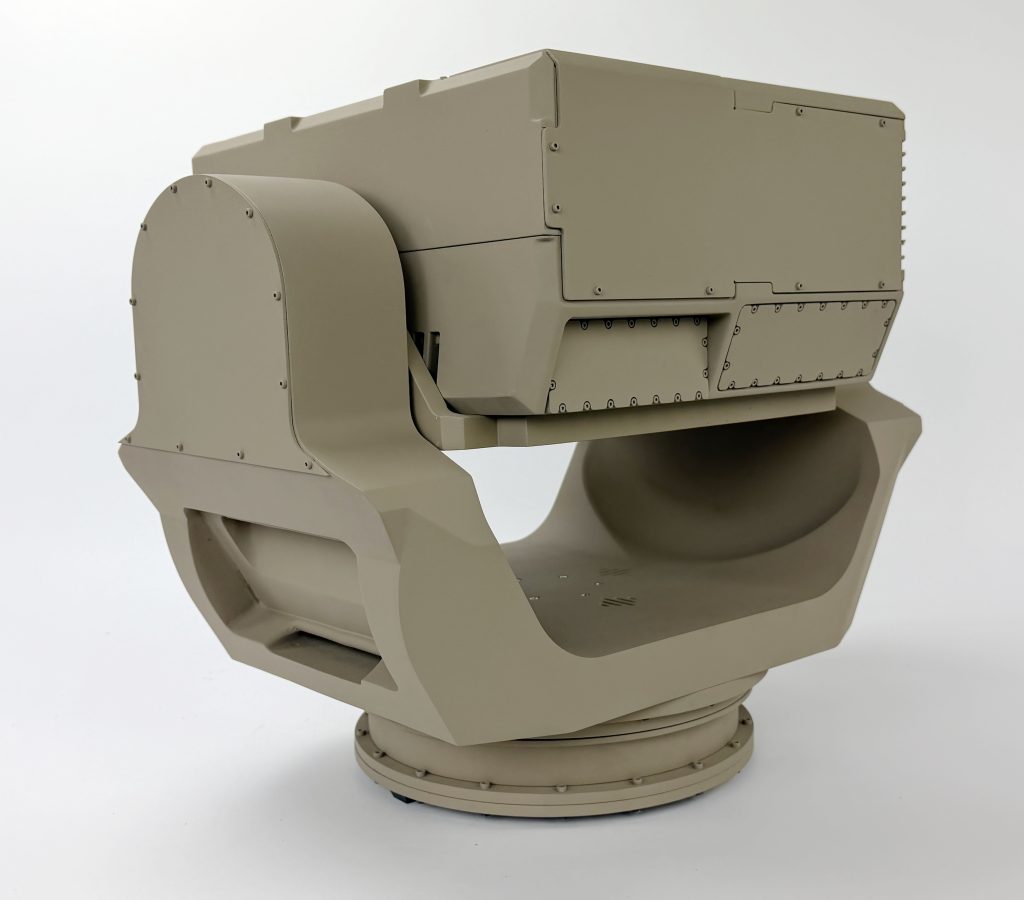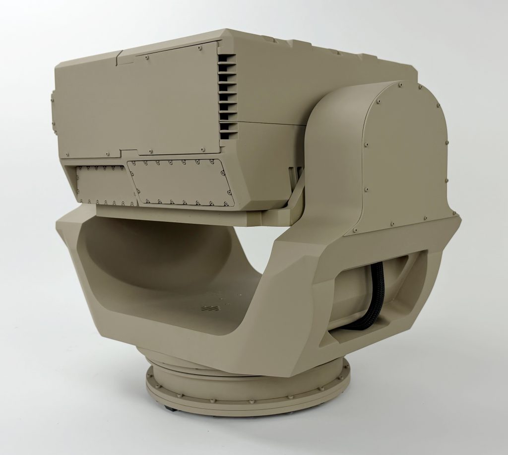 This gimbal model is 2/3 scale and rotates in two directions to draw the attention of exhibit goers. It measures about 20” wide and 20” tall.