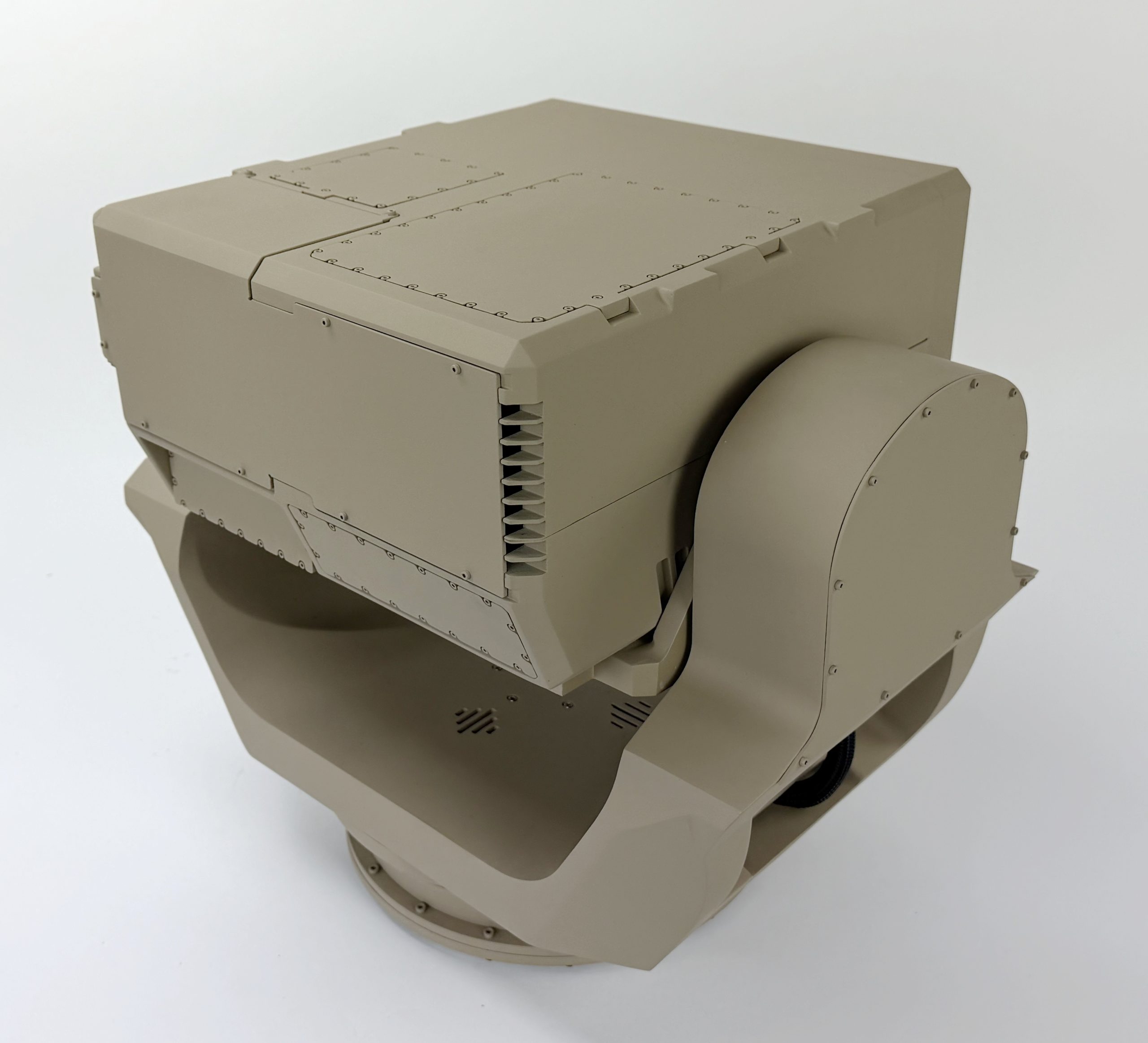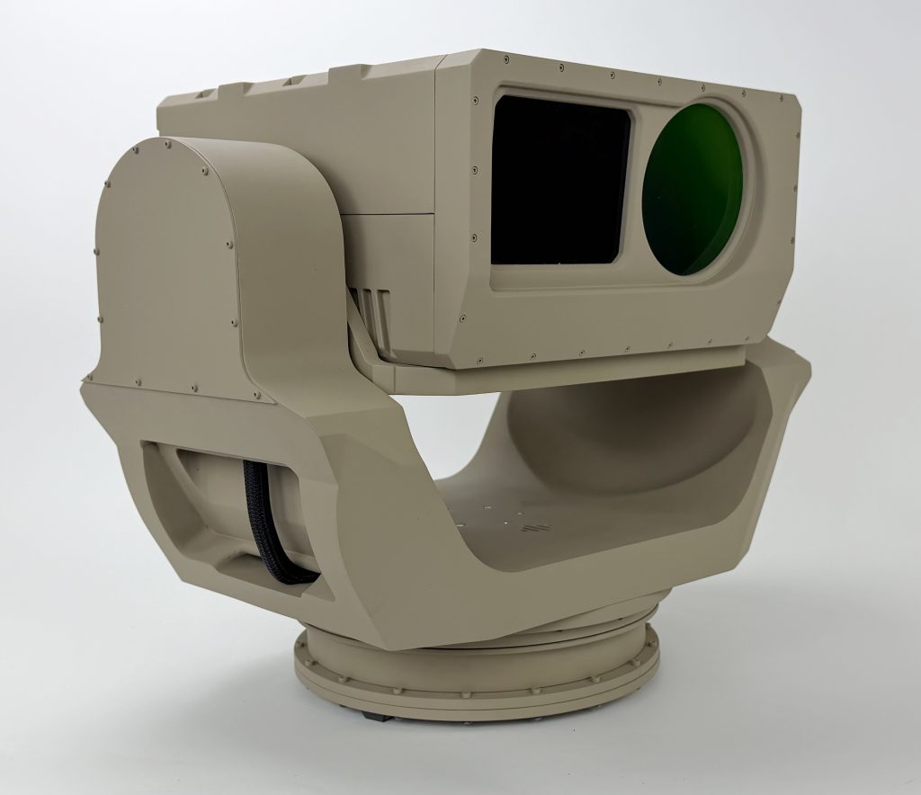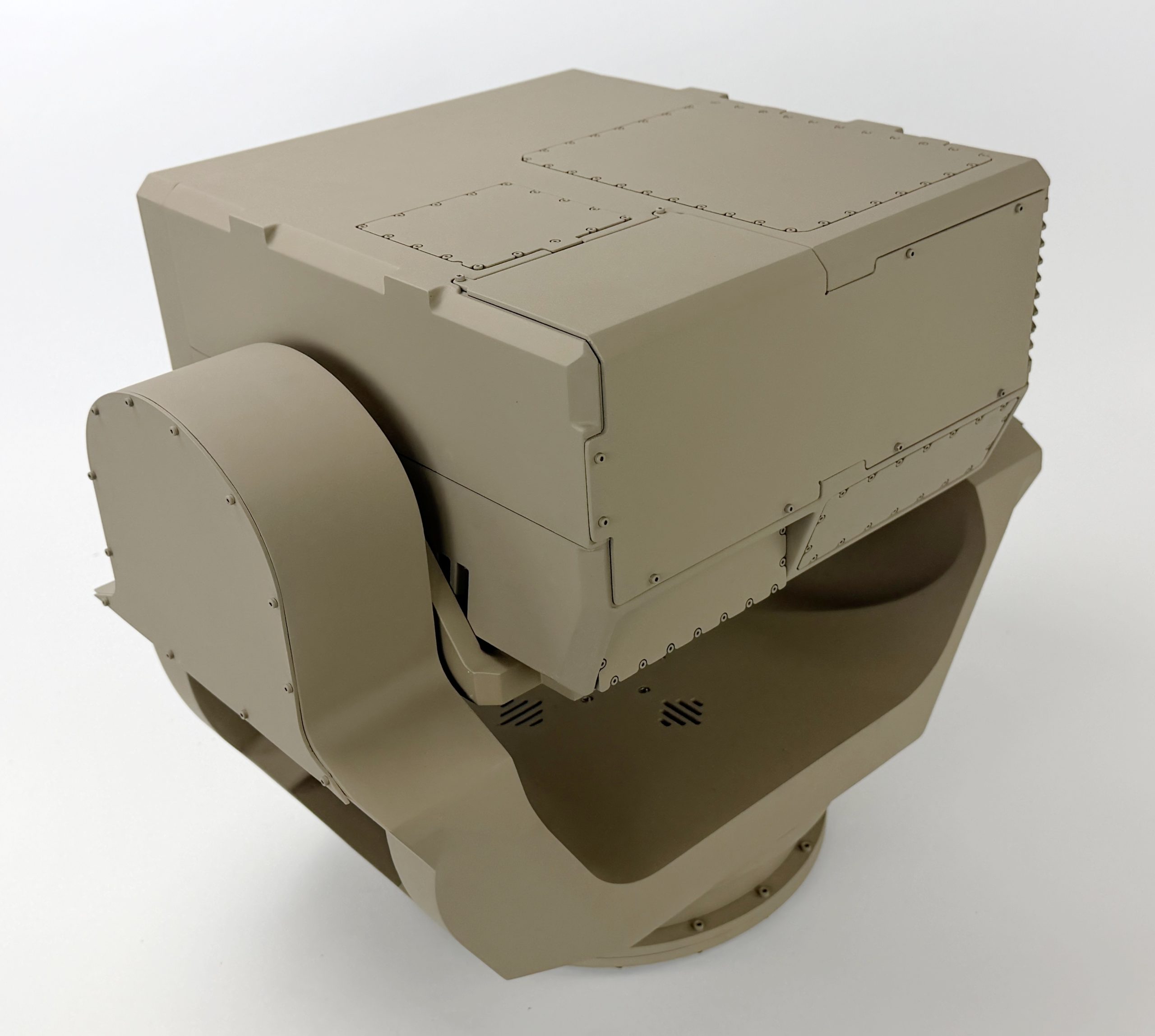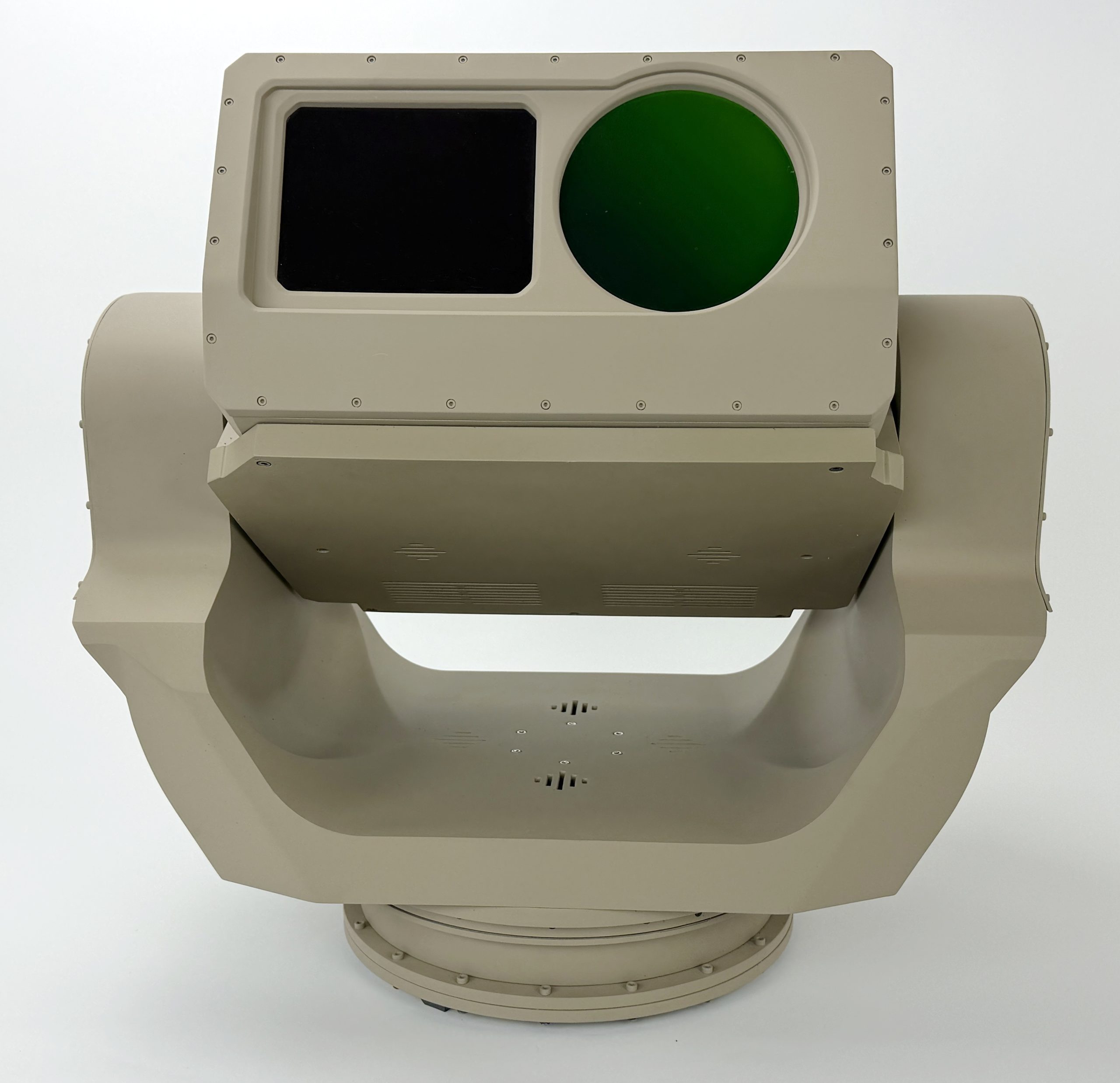 This gimbal model is 2/3 scale and rotates in two directions to draw the attention of exhibit goers. It measures about 20” wide and 20” tall.