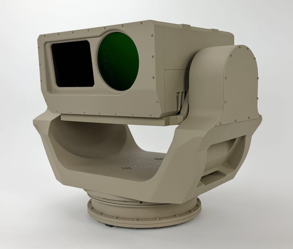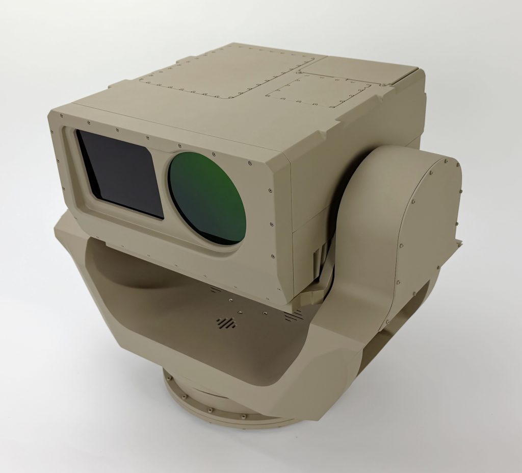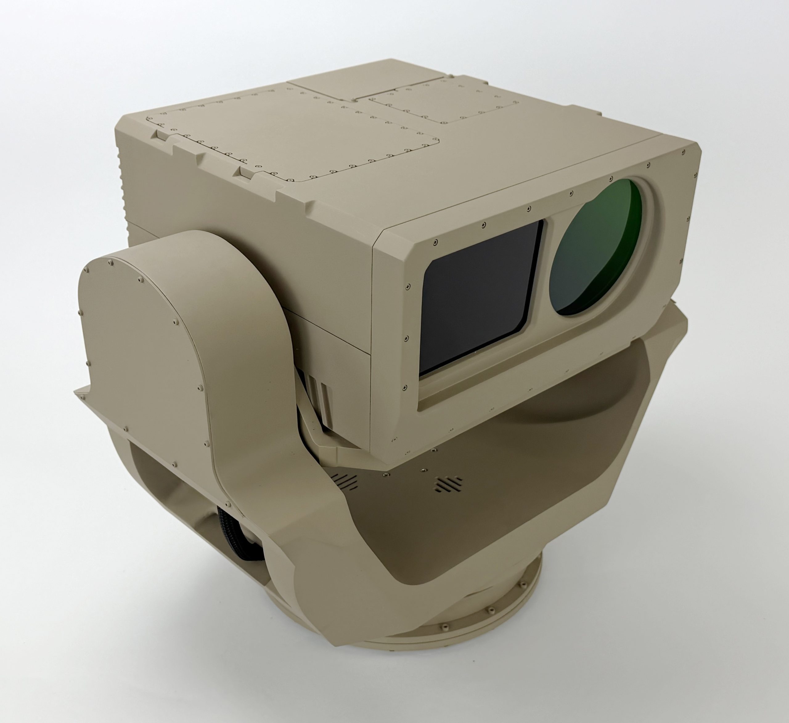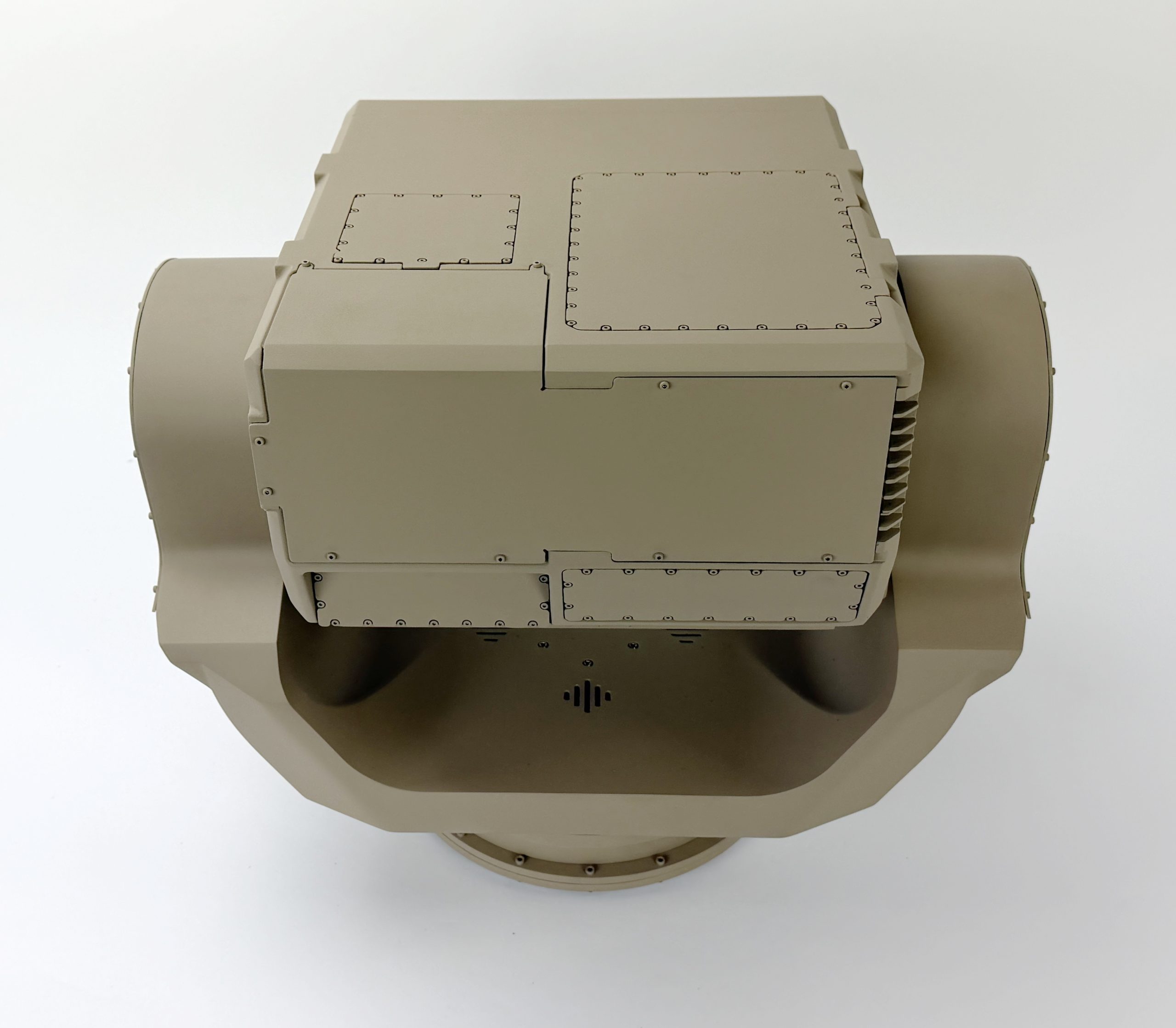 This gimbal model is 2/3 scale and rotates in two directions to draw the attention of exhibit goers. It measures about 20” wide and 20” tall.