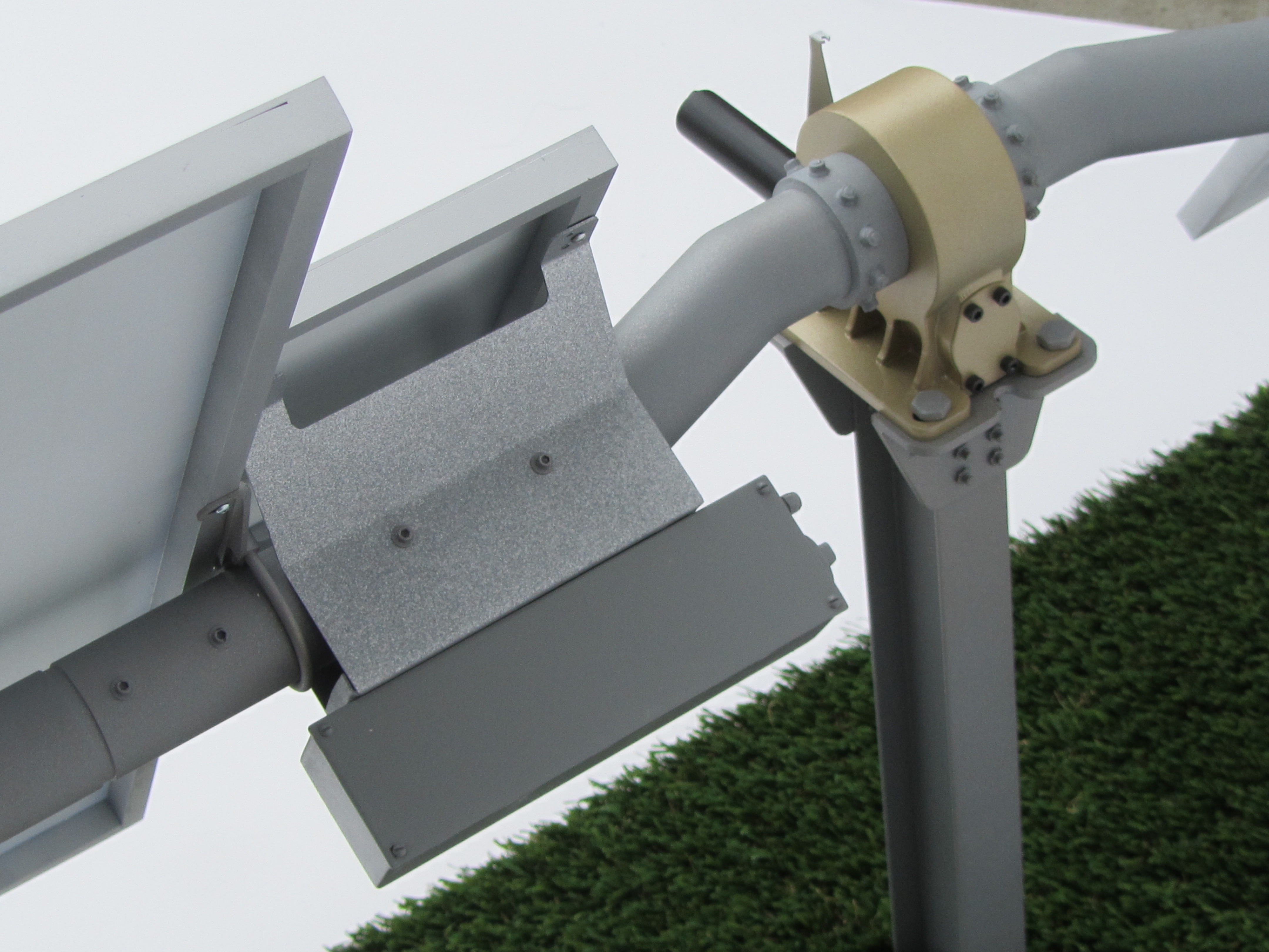 The second solar array model is a close up of the first model. This replica focuses on the center section of one pair of panels. The purpose of the blown up section of the model is to feature the gear box and motor area of our client’s product.The materials used on this model are aluminum, ABS, brass and acrylic.