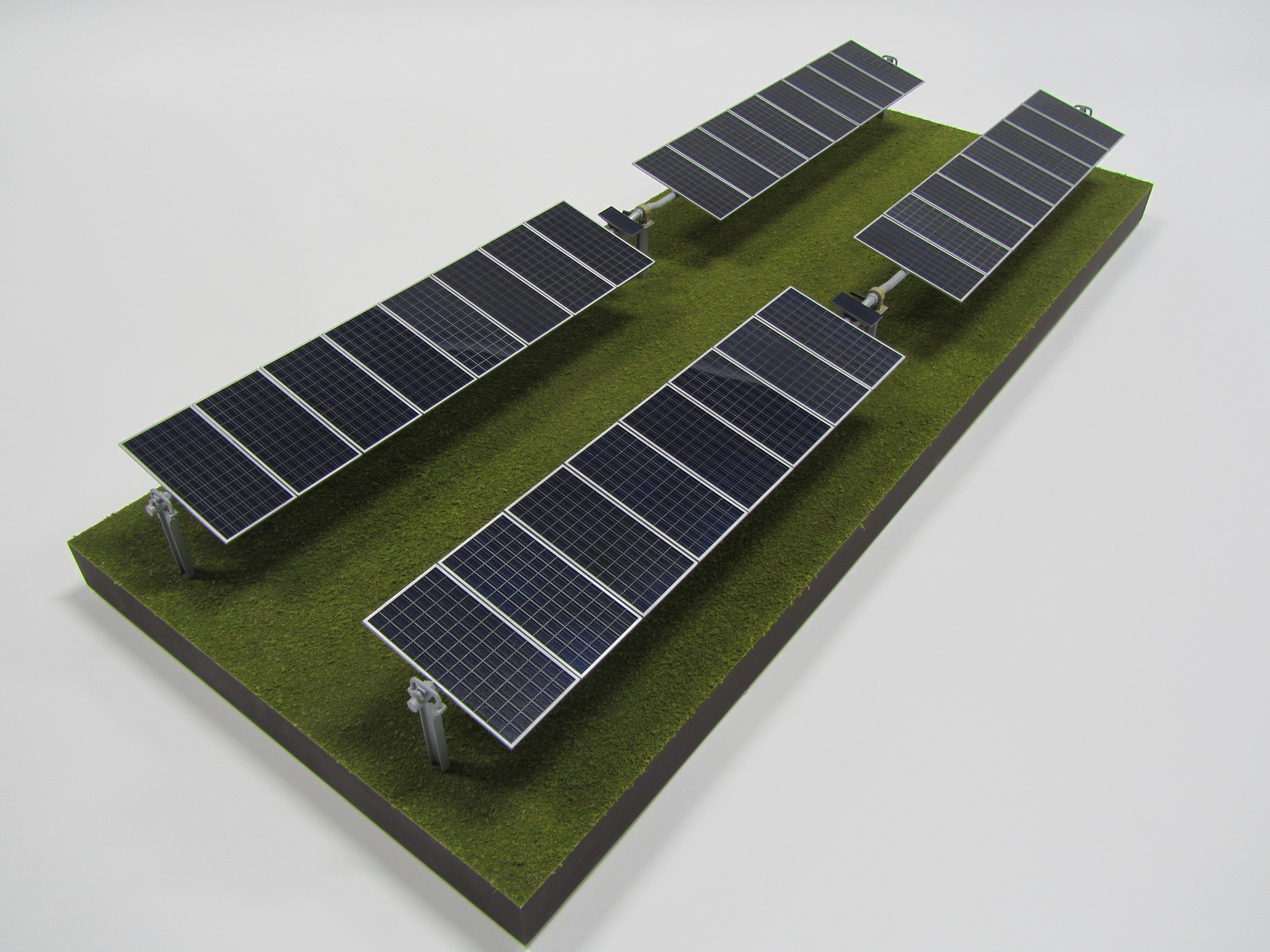 These two Solar Array Models are replicas of the same product. The longer model represents a tiny section of a solar farm. Typically solar farms have hundreds, if not thousands, of these panels across acres of land. The model is built almost entirely out of brass with acrylic panels. The panels can be rotated just like the real product. The purpose of this solar array model is to demonstrate the wide range of motion in this design.