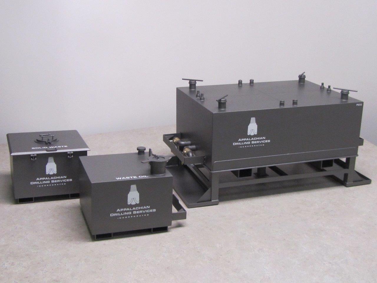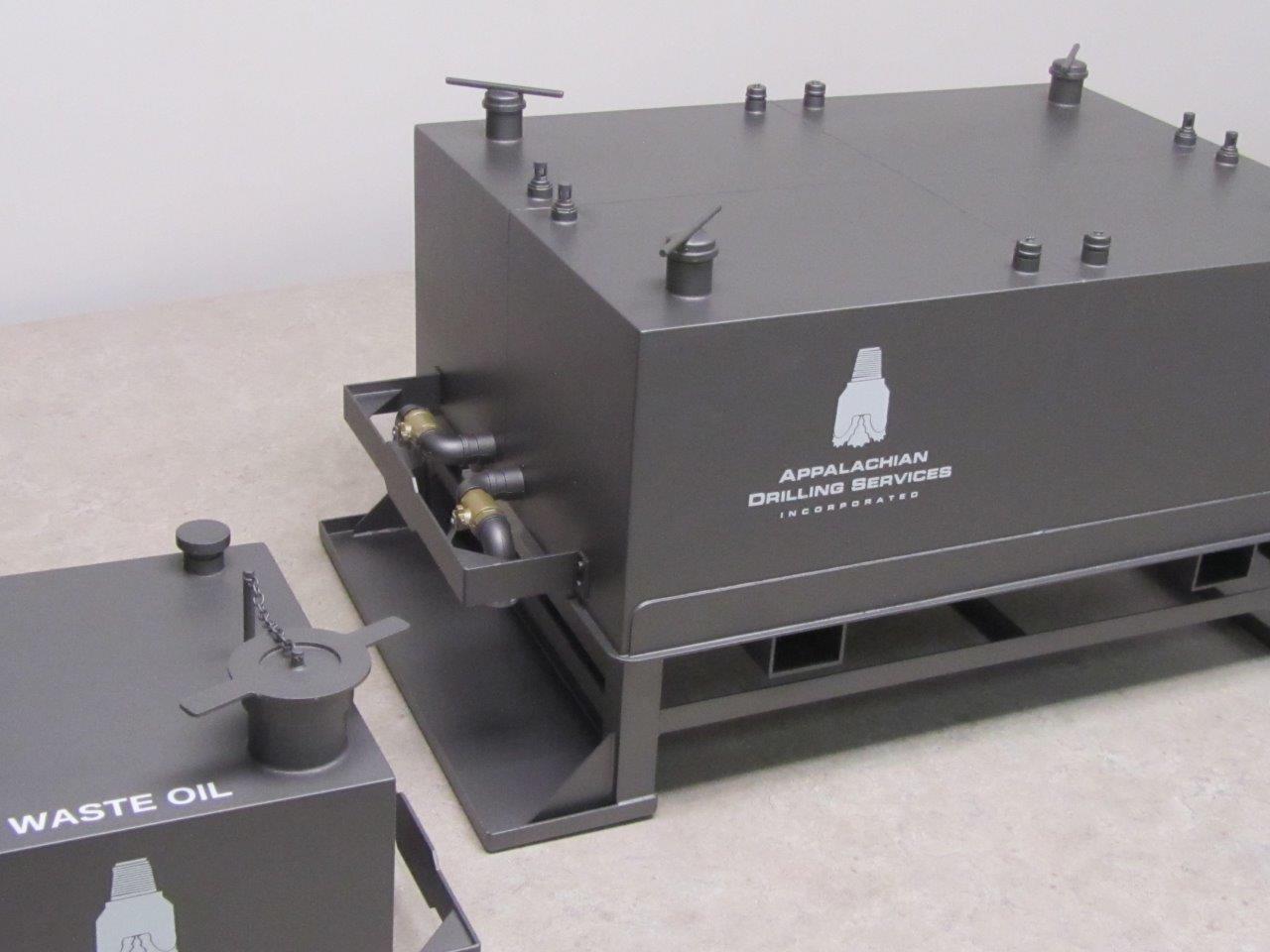 These storage container models were built as sales tools for trade show use. The actual products are used to store oil and waste in the petroleum industry and are too large to ship from show to show.