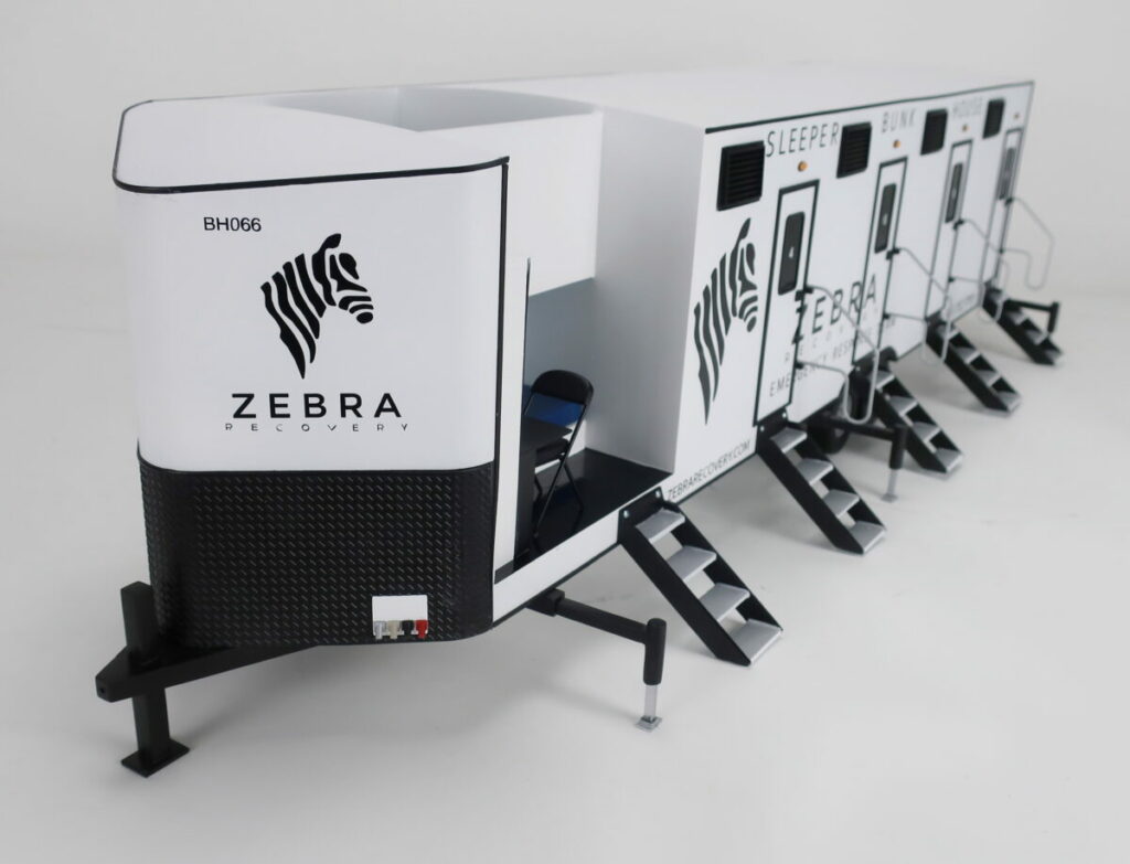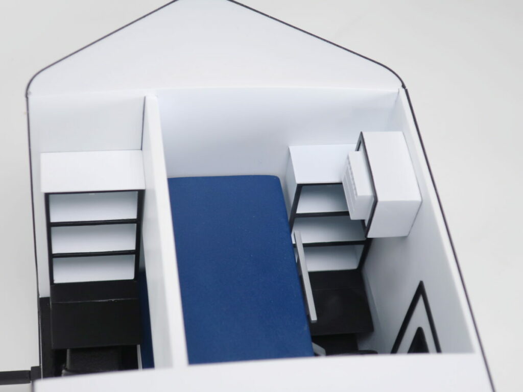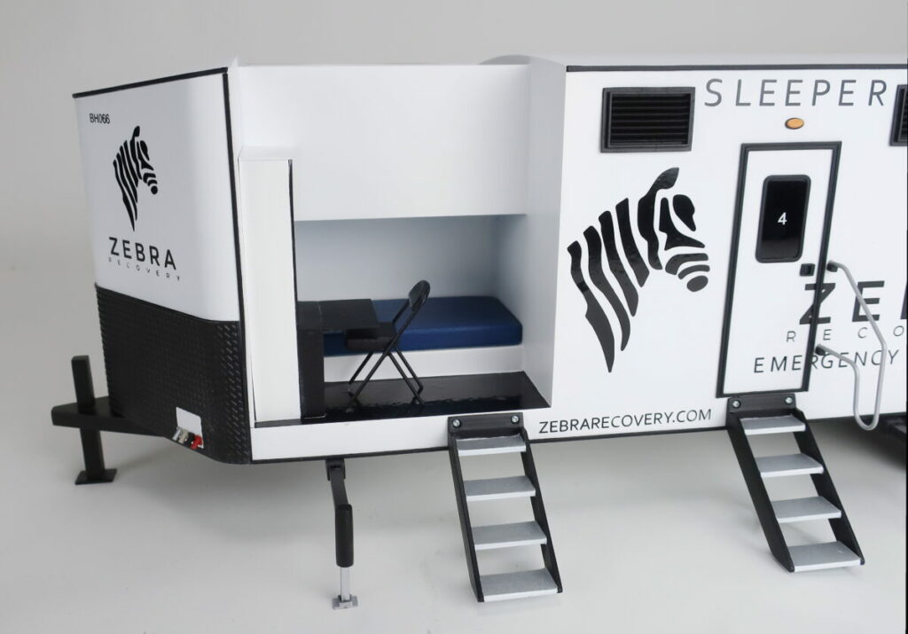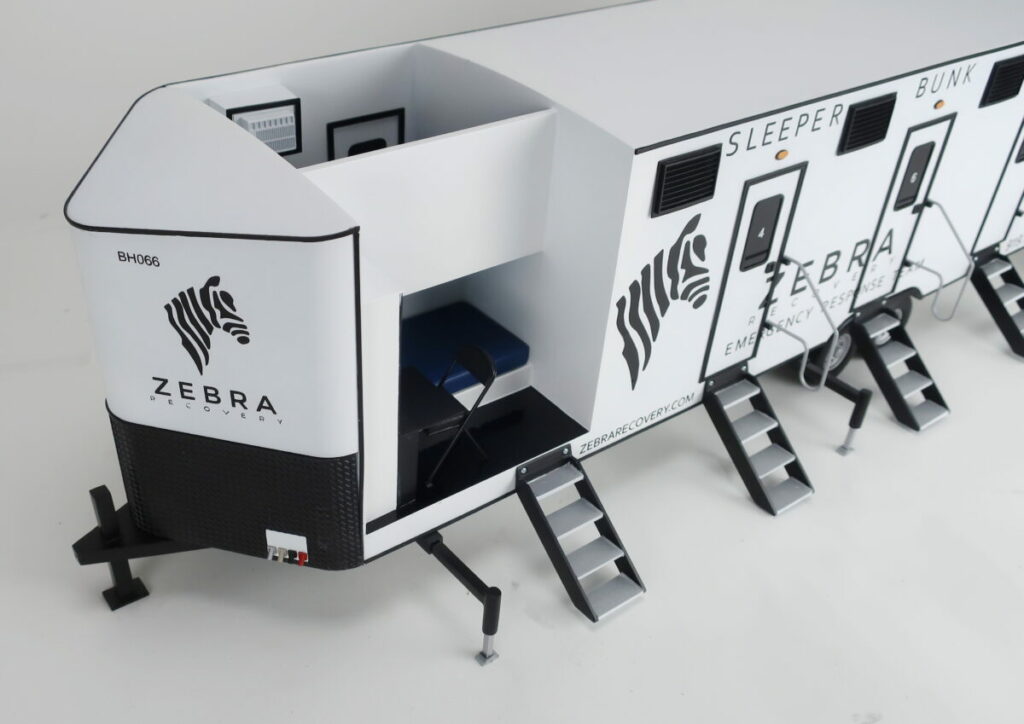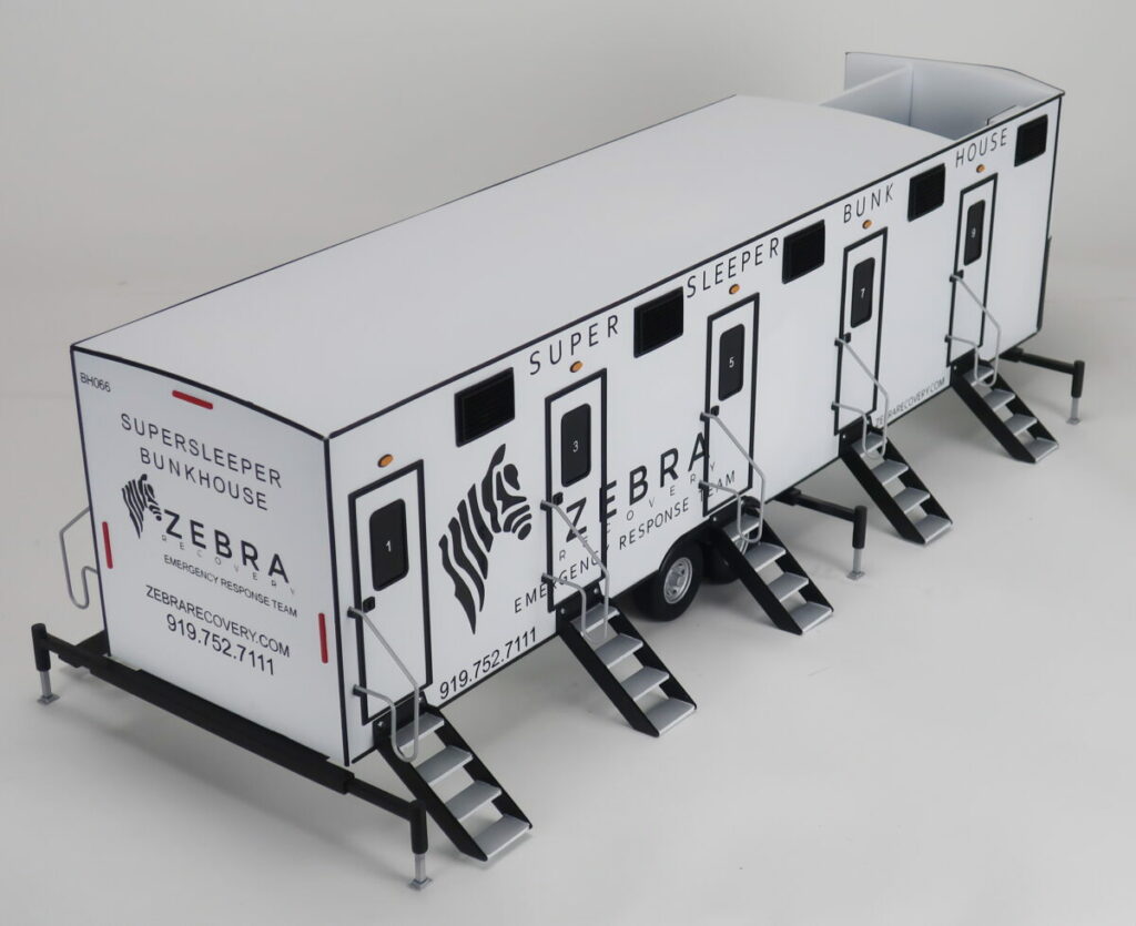 This sleeper trailer model is 1/16th scale and is about 30″ long. The trailer scale model is cutaway to show the interior of the bunkhouse and the layout of the each room — one with an upper bunk and one with a lower bunk. These trailers are used in emergency situations where quick access to shelter is necessary.