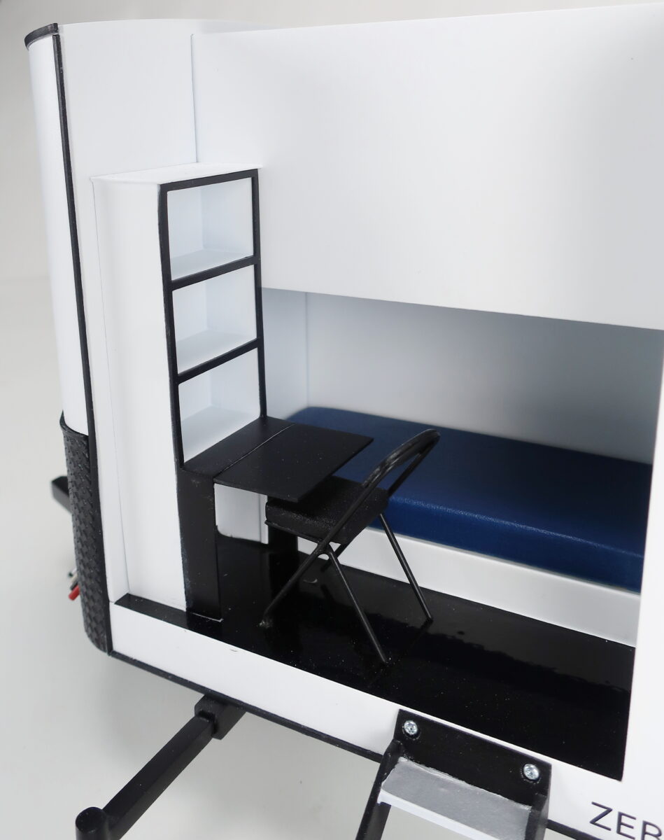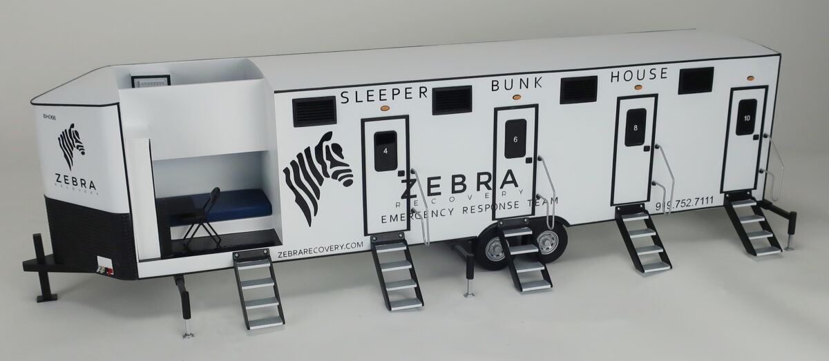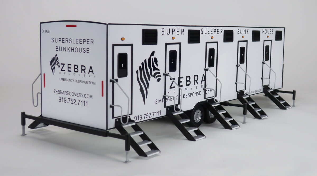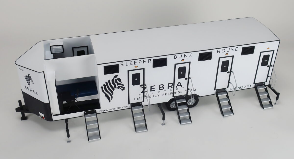 This sleeper trailer model is 1/16th scale and is about 30″ long. The trailer scale model is cutaway to show the interior of the bunkhouse and the layout of the each room — one with an upper bunk and one with a lower bunk. These trailers are used in emergency situations where quick access to shelter is necessary.