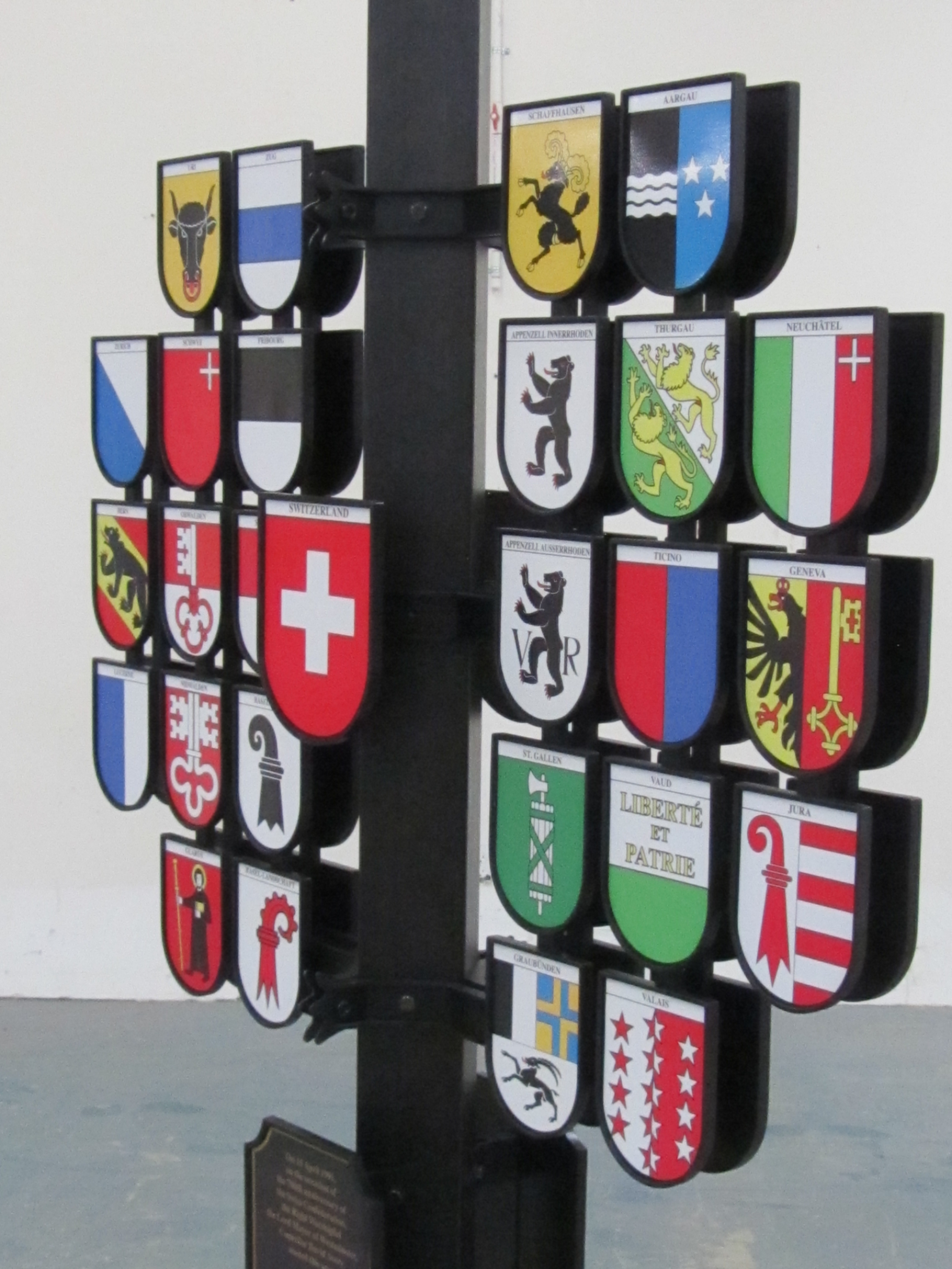 The sign structure is laser cut and assembled out of ABS plastic. The shields are molded and cast. The images for the cantons were taken off the internet and sent to a sign maker to print on vinyl.