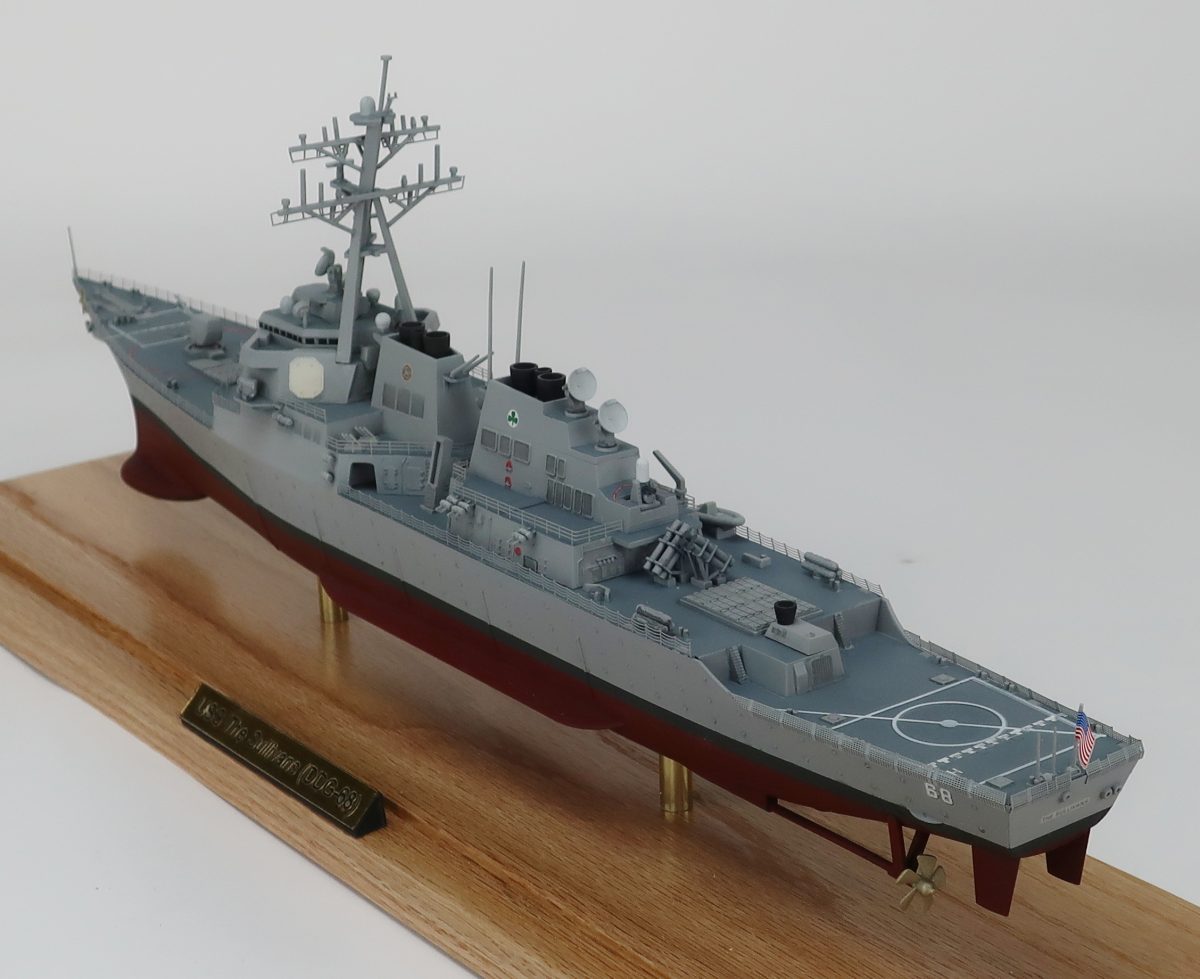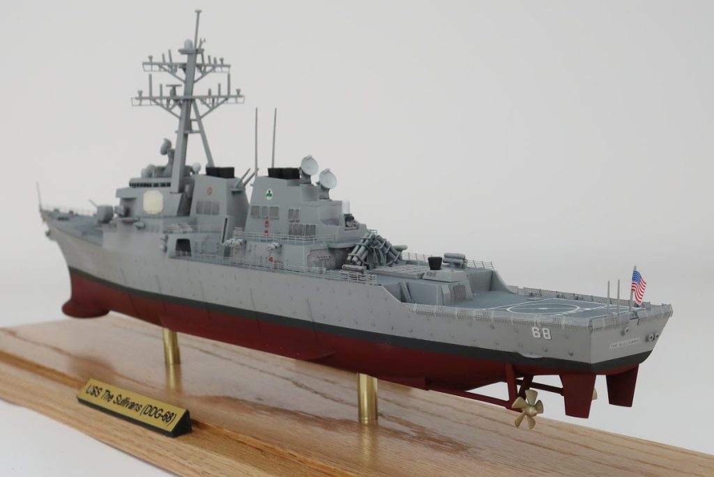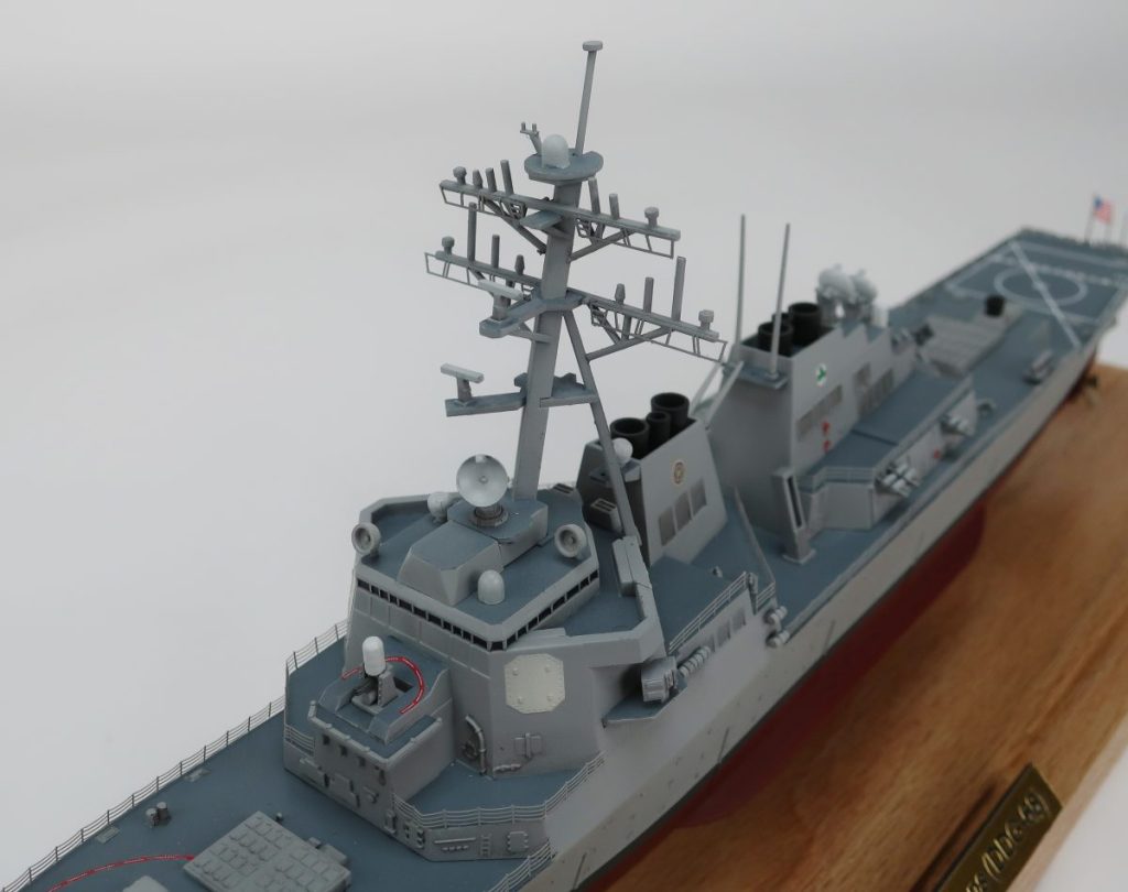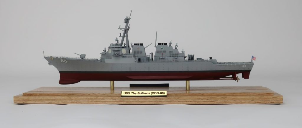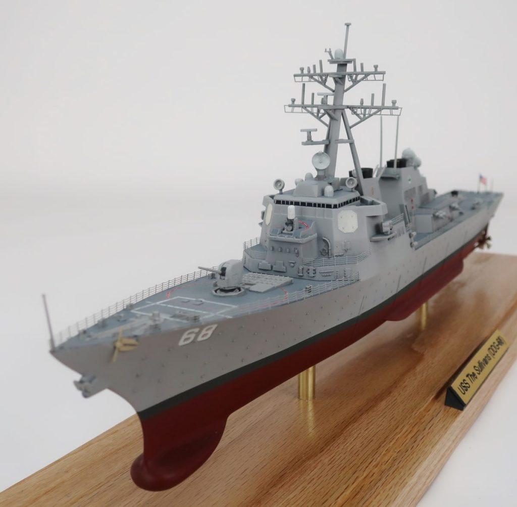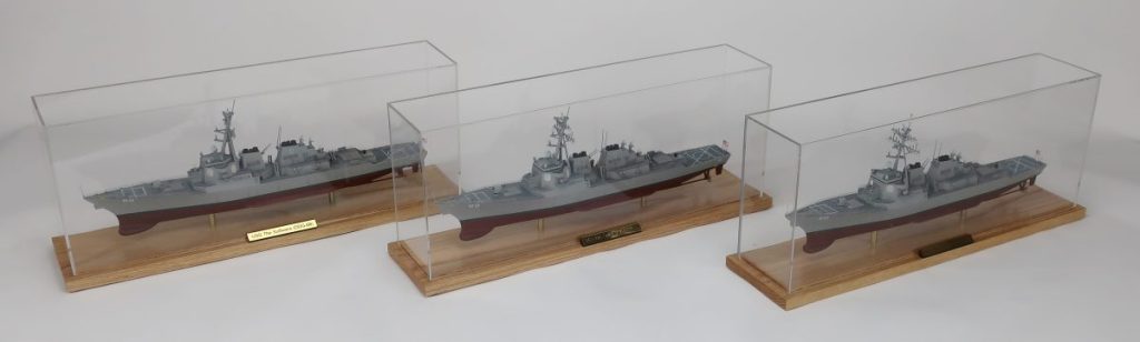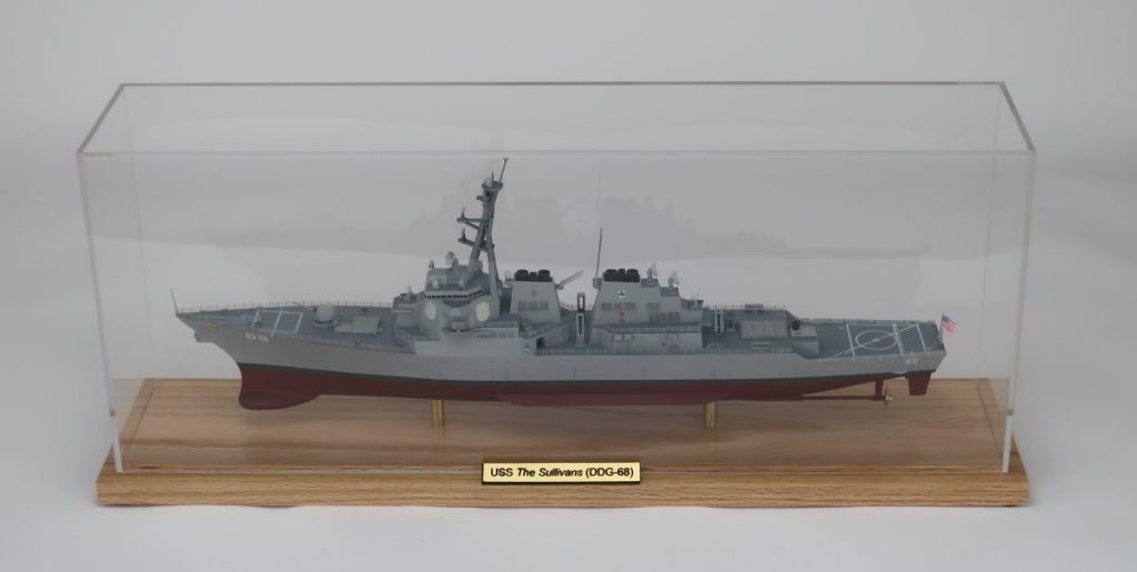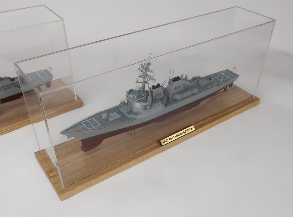 These beautiful models of the USS The Sullivans DDG-68 were built from an existing plastic kit. This allows us to professionally build and paint a high-quality display piece that costs a significant amount less than building from scratch. Each of these models took about 4 days to build including the oak base and clear cover.