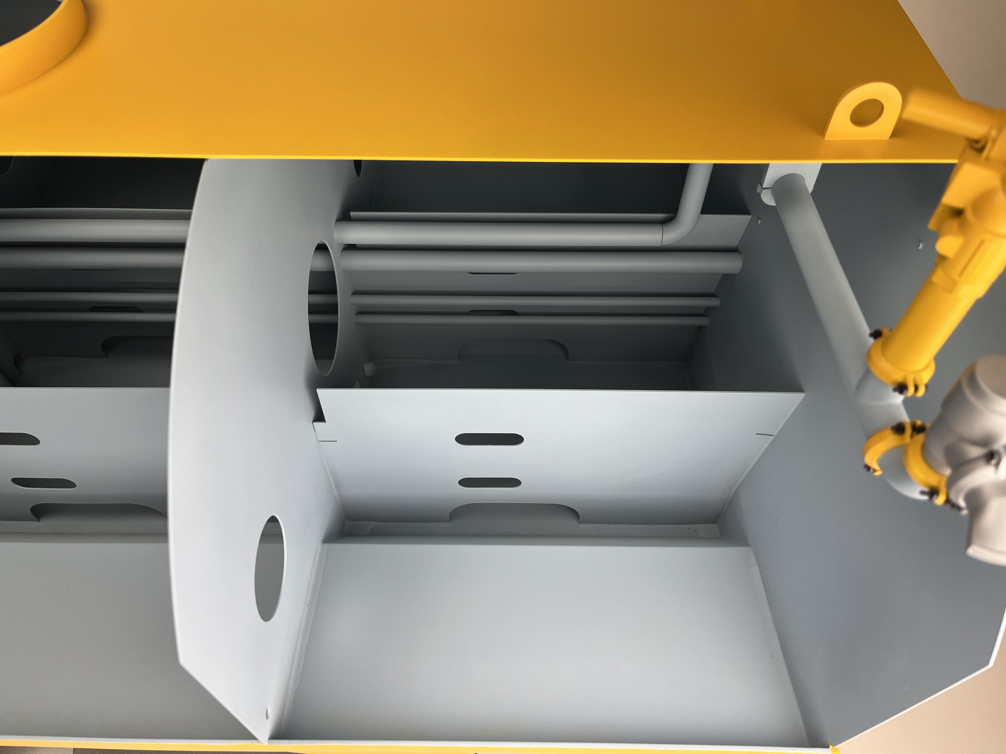 The bottom and the top shell of the model are 3D printed on our giant meter by meter 3D printer. The 6 ribs are cut from .050 aluminum and bonded to each other and the plastic skins with industrial epoxy. The mud flaps and water roller handle are 20ga galvanneal and the rest of the model is either 3D printed, ABS tube or aluminum tube. The base was bent in our sheet-metal shop out of 16ga galvanneal.